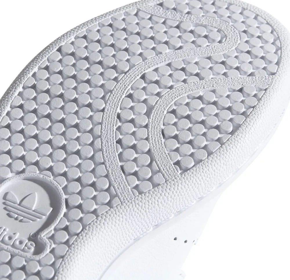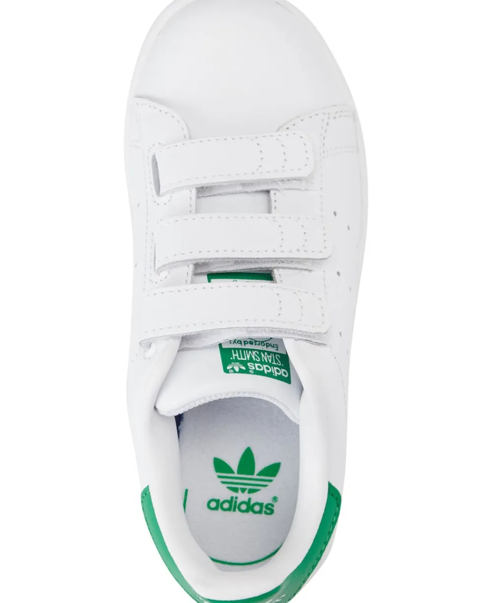 Smarte Stan Smith sneakers fra Adidas. Disse sko er hvide og har grønne detaljer. De har en tyk sål og lukkes med velcro. Med disse sko er barnet sikret komfort. Skoene er ideelle til bevægelse. De kan med fordel bruges sammen med et par bukser.
