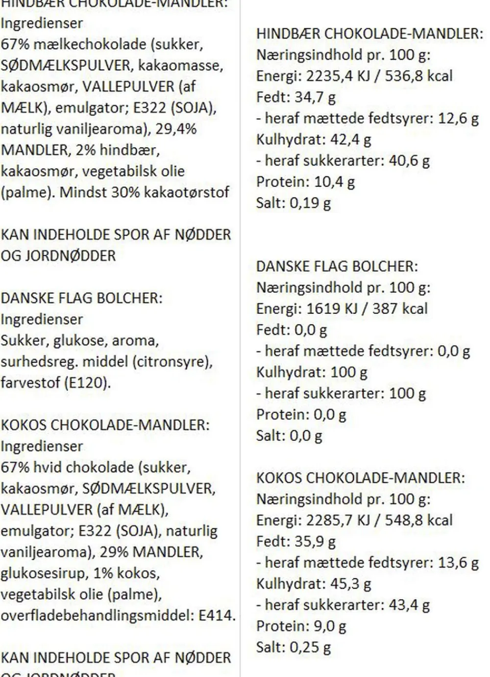Gaveæsken indeholder en pose danske flag bolcher med smag af jordbær, en pose mandler rullet i mælkechokolade og hindbær, samt en pose mandler rullet i hvid chokolade og kokos – Tre generationer har indtil nu været i gang med kogning af de søde ting og sager på almuegaarden, hvor gode råvarer, naturlige ingredienser, og ikke mindst det gode danske håndværk holdes i hævd.