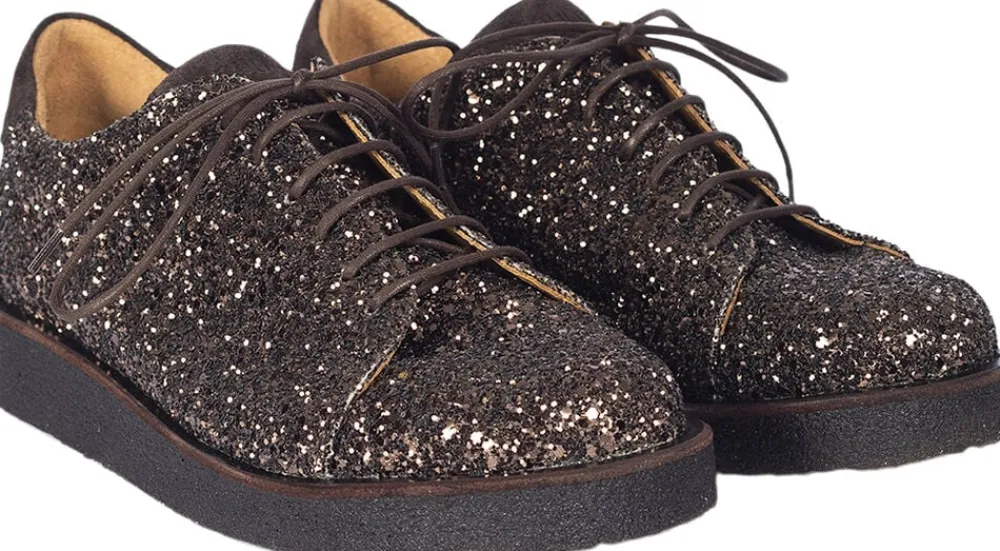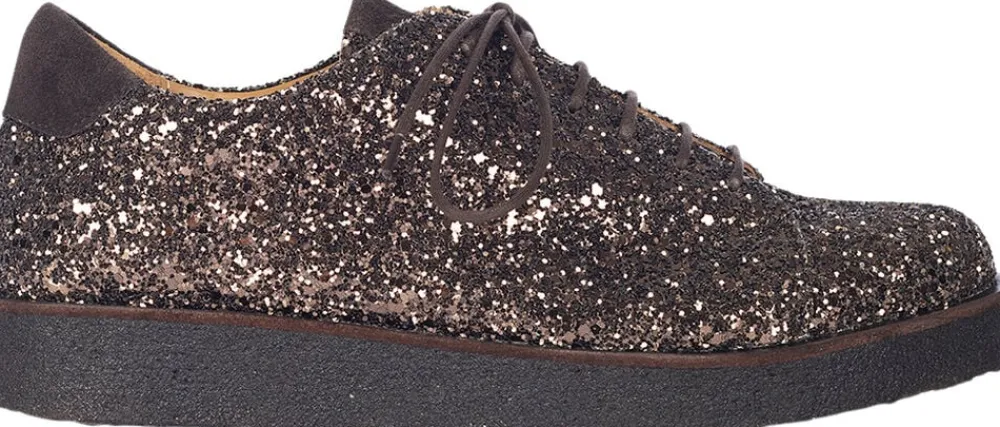 Funklende glitter-sneaker med plateausål. Sneakeren har en rund snude, justerbar snørelukning, ruskindslogo på tungen, polstret ruskindskrave for ekstra komfort og støtte,