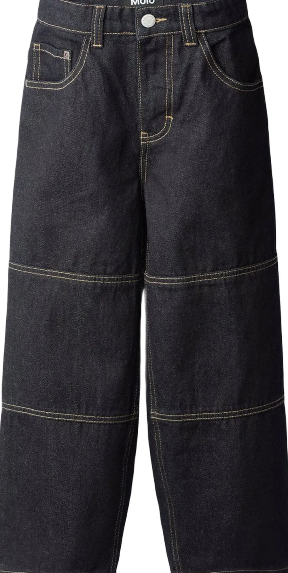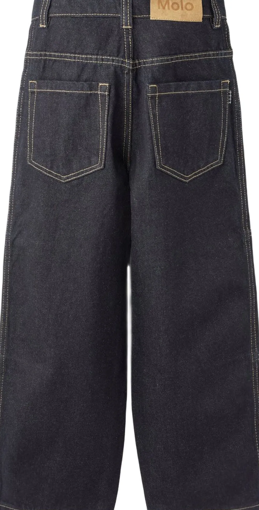 Disse mørkeblå oversize jeans fra Molo er lavet i rå denim med lyse stikninger ved knæene. Jeansene har 5 lommer, bæltestropper og en oversize pasform. Livvidden kan justeres med en indvendig elastik for optimal pasform til alle børn. Størrelser 92-134 har trykknap, mens størrelser 140-176 har en almindelig jeansknap. For en mindre løs pasform anbefales det at vælge en størrelse mindre, især hvis barnet er mellem to størrelser.