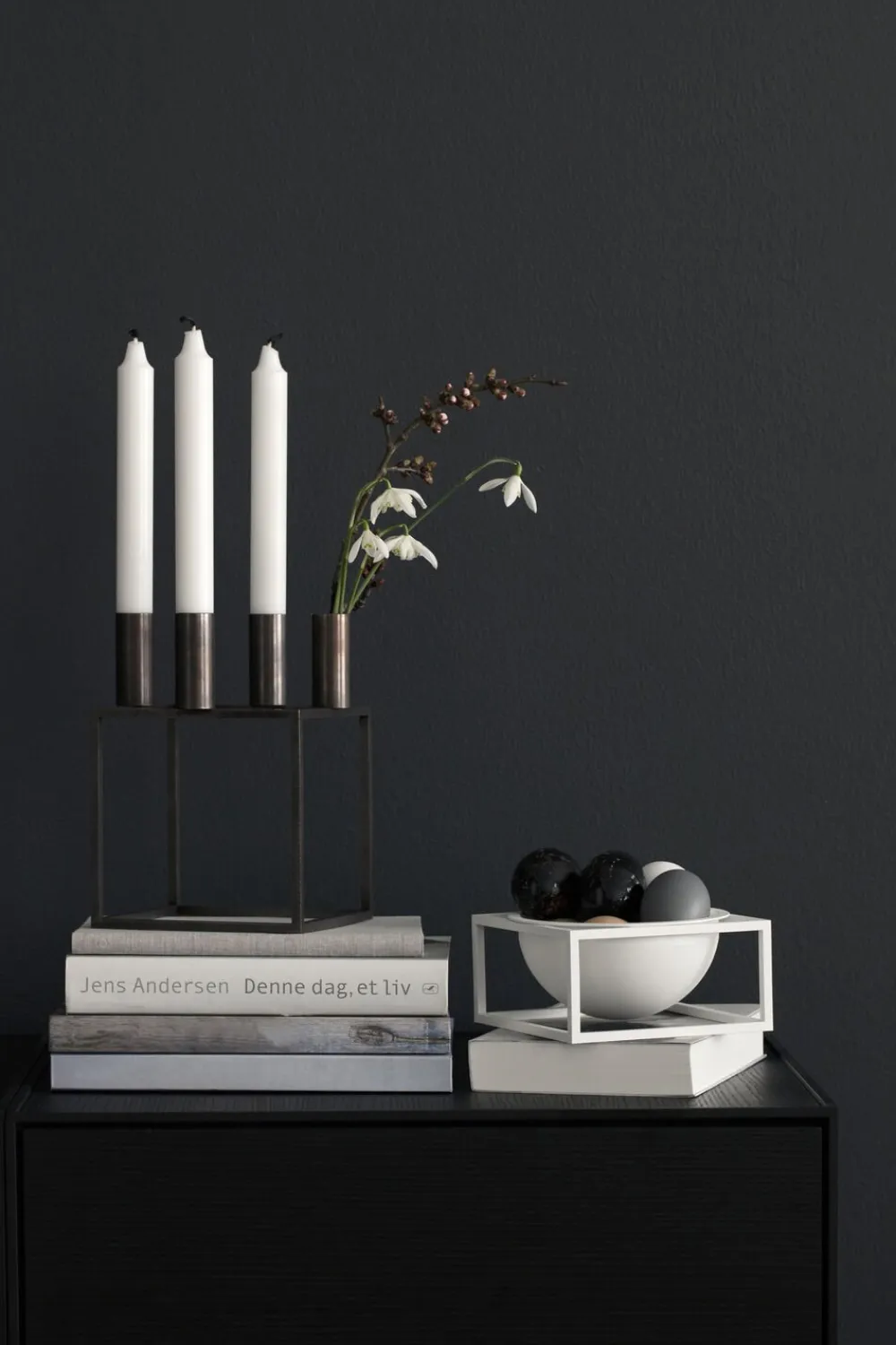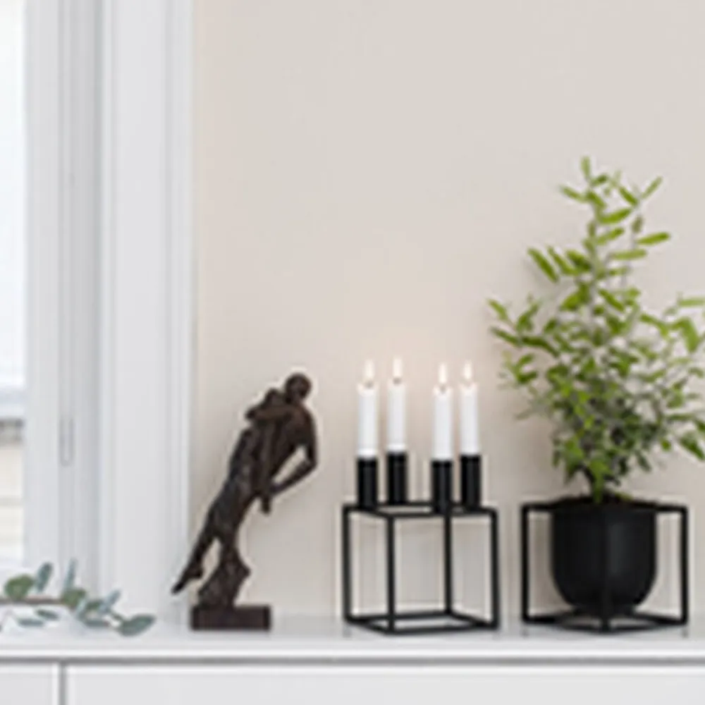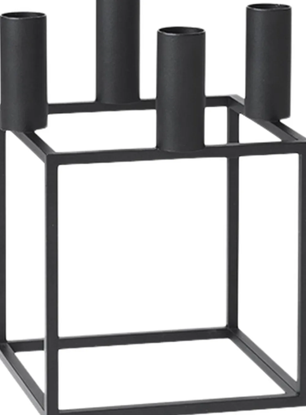Kubus 4 lysestagen i sort er fremstillet i støbejern og tegnet af Mogens Lassen i 1962. Lysestagen fås i hvid, sort, bruneret kobber, nikkel samt messing. Med skarp fornemmelse for nutidens funkisstil designede Mogens Lassen i 1962 de ikoniske Kubus lysestager, dengang forbeholdt familien og de nærmeste arkitektvenner. Kubus fremstilles fortsat i Danmark, og har blandt arkitekter og designelskere opnået status som et moderne internationalt designikon. Rengøring: Vend stagen med lyseholderne ned ad, og placer den på en bageplade med bagepapir stående på lyseholderne. Sættes i en 75 grader varm ovn i 15-20 minutter. Stagen tørres herefter af med en fugtig klud. NB! Brug aldrig skarpe genstande eller kogende vand til at rengøre lysestagen med. Vi anbefaler, at du ikke lader lysene brænde helt ned i stagen, da dette kan medføre misfarvning eller skader på lakeringen.
