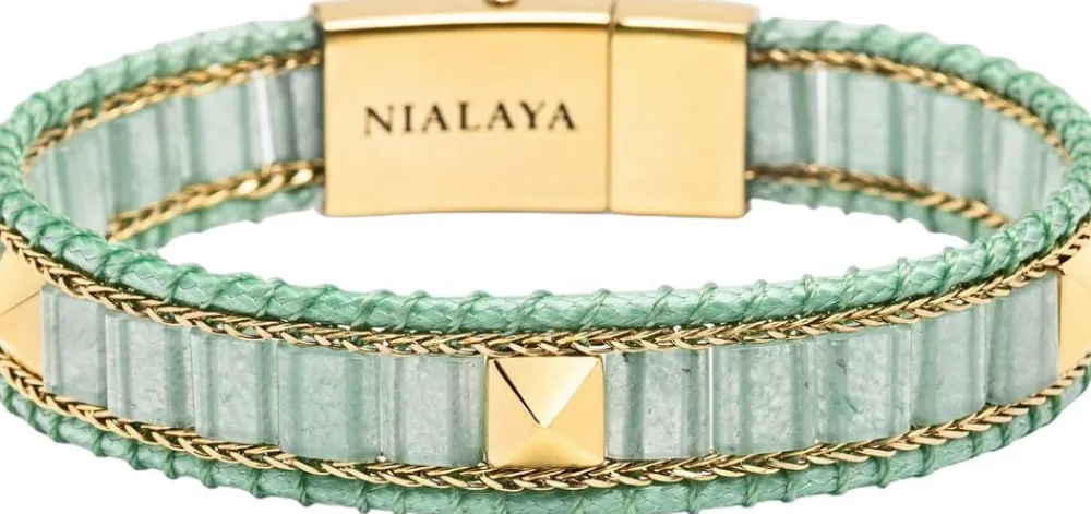 Grøn Aventurin Stud-armbånd til kvinder, 10 mm armbåndsbredde, 6 mm grønne Aventurin-perler, poleret 18K00 guldbelagt lås og stropper, vævet streng og kædedetaljer. Håndlavet i Los Angeles