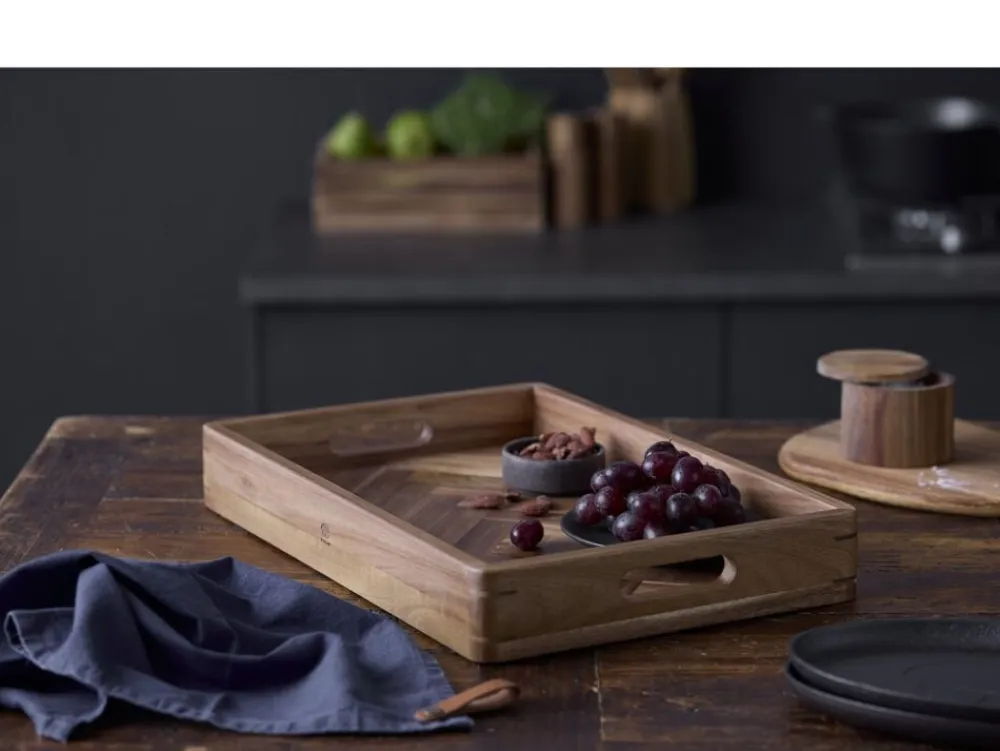 Flot bakke i akacietræ med elegant sildebensmønster. Den høje kant og de praktiske bærehåndtag gør bakken perfekt til flot servering af morgenmad, snacks eller drikkevarer. 40 x 30 cm. Læg aldrig bakken i blød, men tør den i stedet over med en fugtig klud. Tåler ikke maskinopvask. Varen er produceret i akacietræ.