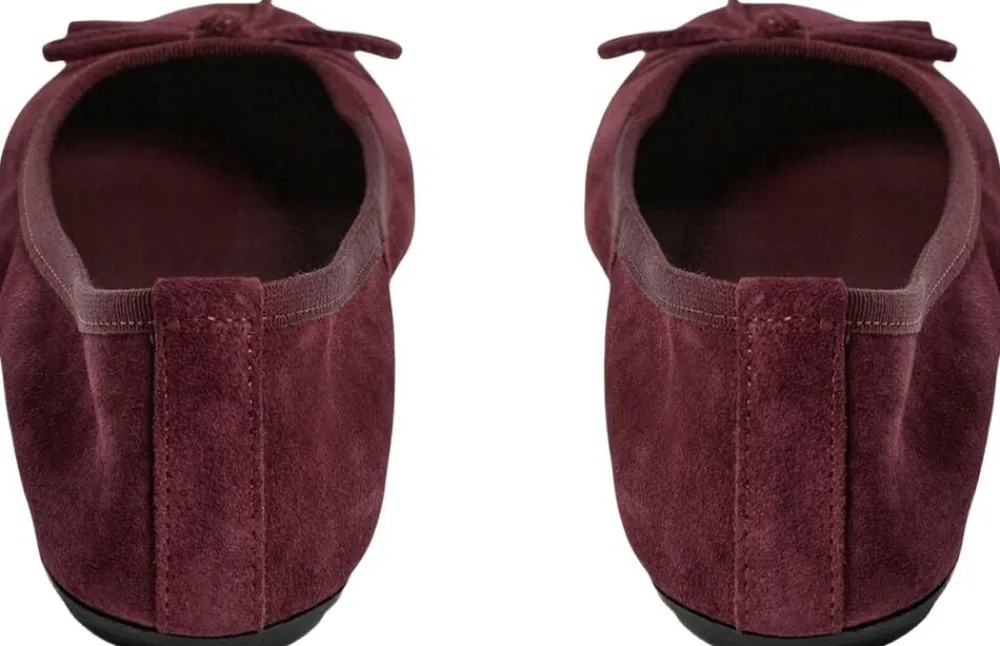 Sød ruskind ballerinasko med sløjfe over vristen. Skoen er designet i 100% læder med gummisål