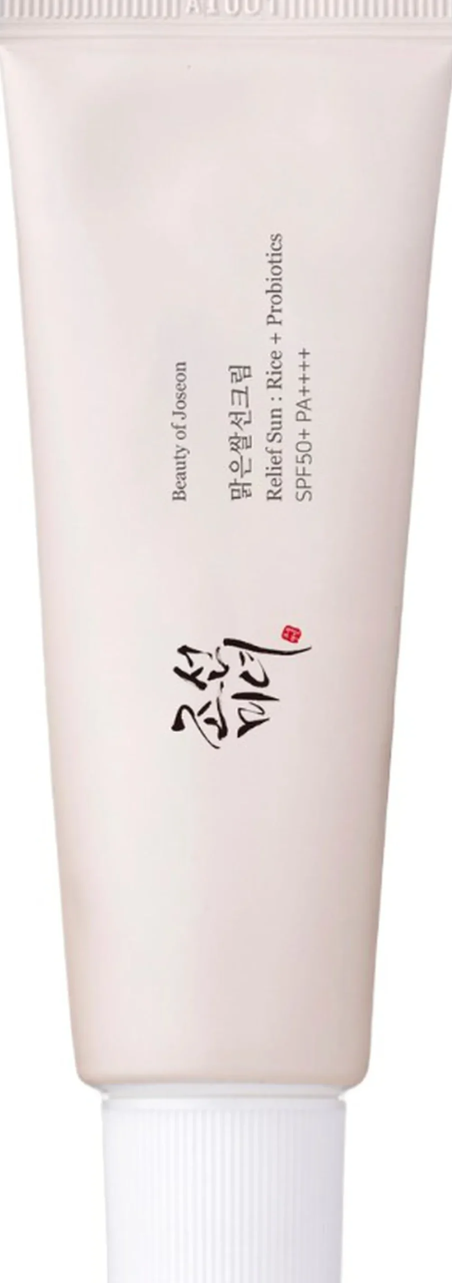 Relief Sun: Rice + Probiotics fra Beauty Of Joseon indeholder også niacinamid, adenosin og vitamin E, som er foryngende ingredienser, der hjælper med at reducere bumser, ujævn hudtone, store porer, fine linjer og rødme.