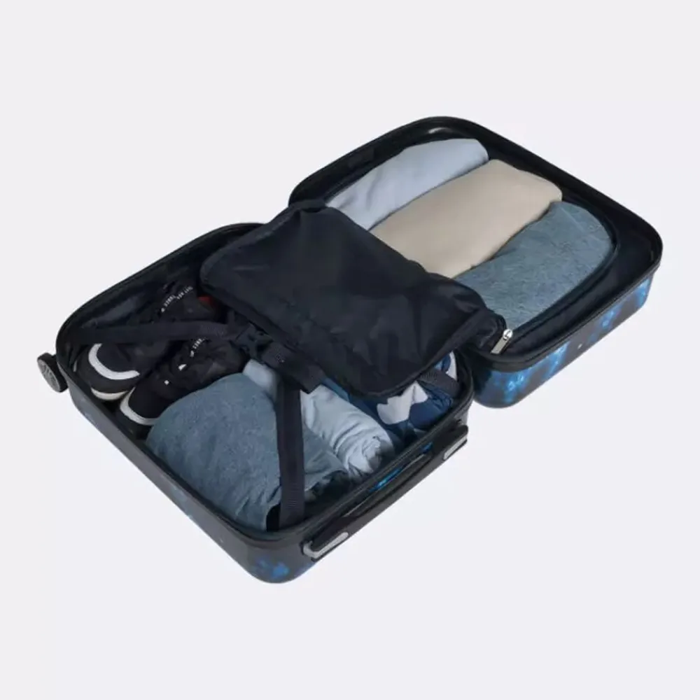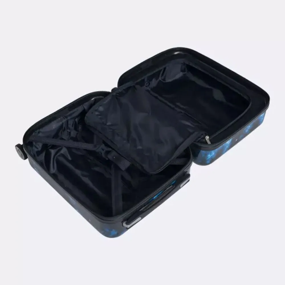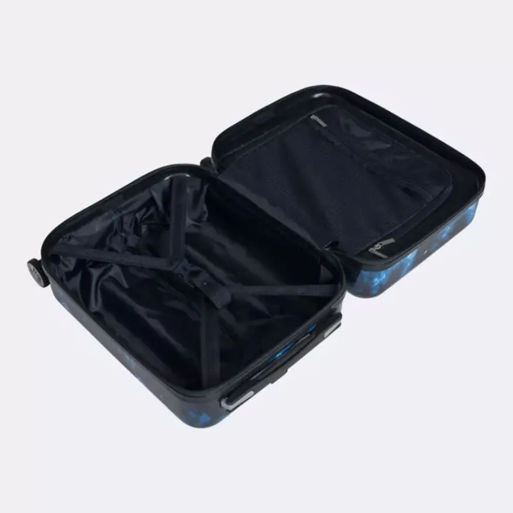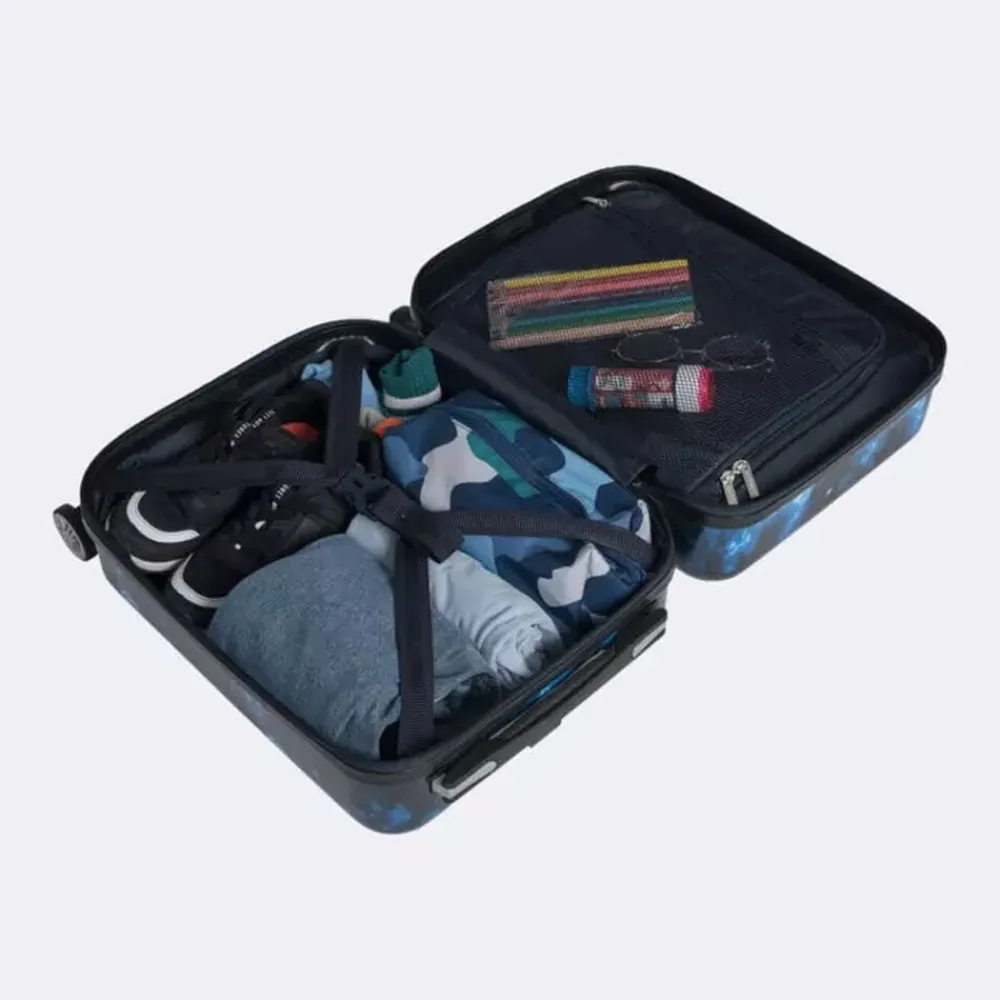 Det er stort at få sin første kuffert! Vores børnekuffert har et magisk design, som virkelig skiller sig ud i mængden. Målene på kufferten tilfredsstiller kravene for håndbagage/kabinekuffert hos SAS og Norwegian. Børnekufferten har 4 dobbelte, stærke og stillegående 360°-spinnerhjul, som gør den let at trille. Med lynlåse i god kvalitet holdes dine ejendele trygge under rejsen. Helforet inderside, opdelt med netlomme, pakkestropper i bunden og et adskilt rum i låget. Integreret teleskophåndtag aflaster arm og skulder for unødig tyngde.