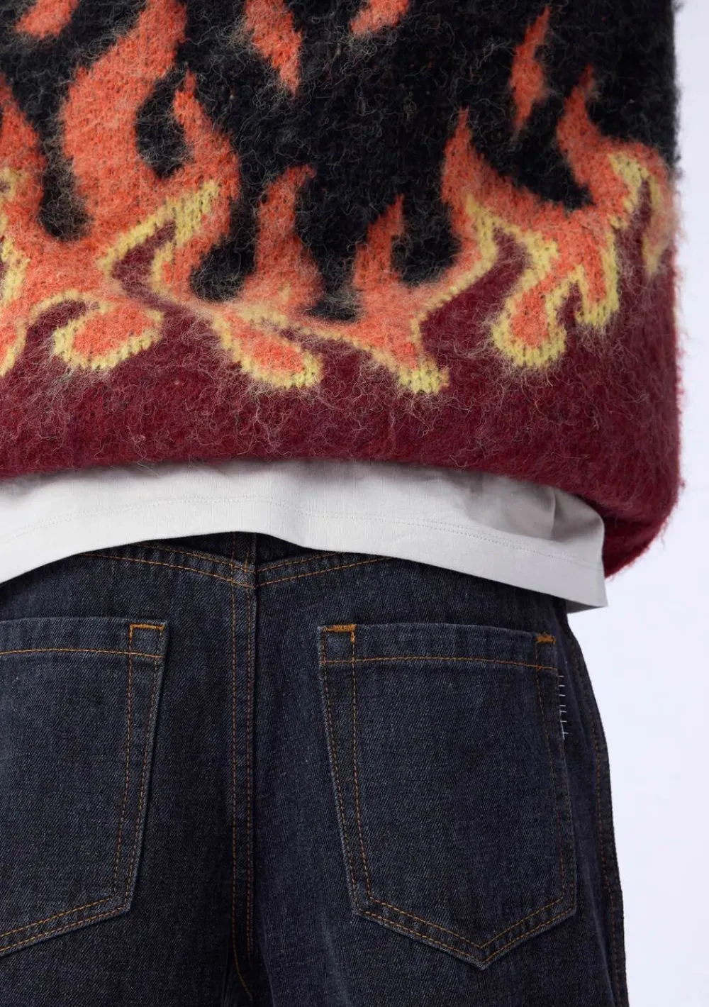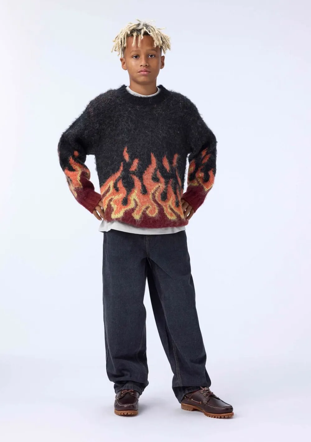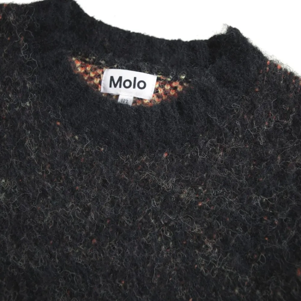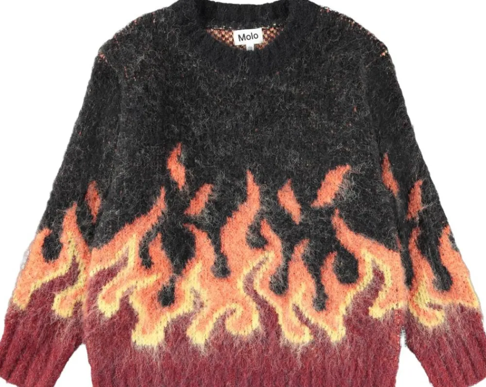 Denne striktrøje fra Molo er fremstillet i en fluffy alpaka uldblanding i røde og sorte nuancer. Trøjen har en rund halsudskæring med ribkant samt rib ved håndled og hofte. Med en løs pasform og et grafisk flammemotiv på ærmer og krop er denne trøje både stilfuld og behagelig.