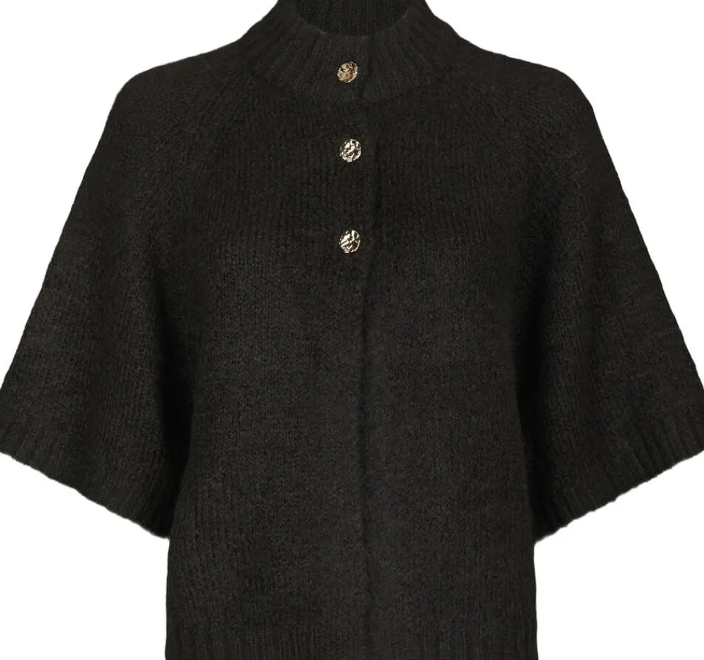 Cardigan med korte ærmer. Cardiganen har en rund halsudskæring, ærmer med vidde og en åben front med tre dekorative knapper. Den er lavet i en blød, fluffy kvalitet og har en løs pasform. Modellen er iført størrelse 36.