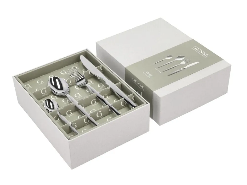 Twist har fået navnet ud fra designet på bestikket, hvor hver del har en et “twist” øverst på skaftet. Bestikket er udført i rustfrit 18/0 stål, hvilket betyder at bestikket er nikkelfrit, hvilket er en stor fordel hvis du lider af nikkel allergi. Twist er blankpoleret og tåler opvaskemaskine. Gaveæsken indeholder: 4x Kaffeskeer, 4x Spiseskeer, 4x Bordgafler, 4x Bordknive. Der findes mange dele i serien, som kan fås i Magasins boligafdeling.