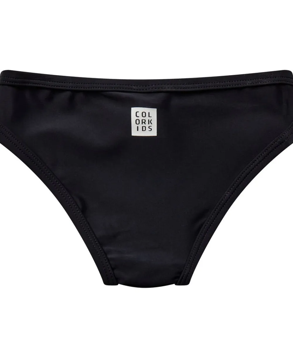 Bikini fra Color Kids. Bikinitoppen smalle ensfarvede kanter og skulderstropper, som former et kryds bagpå. Bikinibukserne har en tynd ensfarvet taljekant. Bikinien er ensfarvet og er hurtigttørrende.