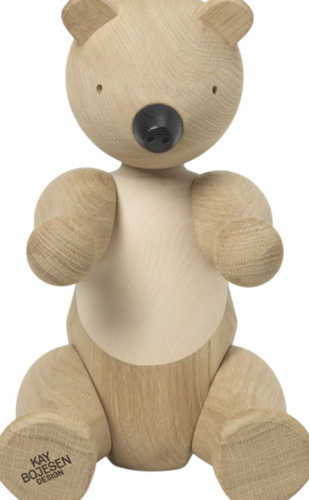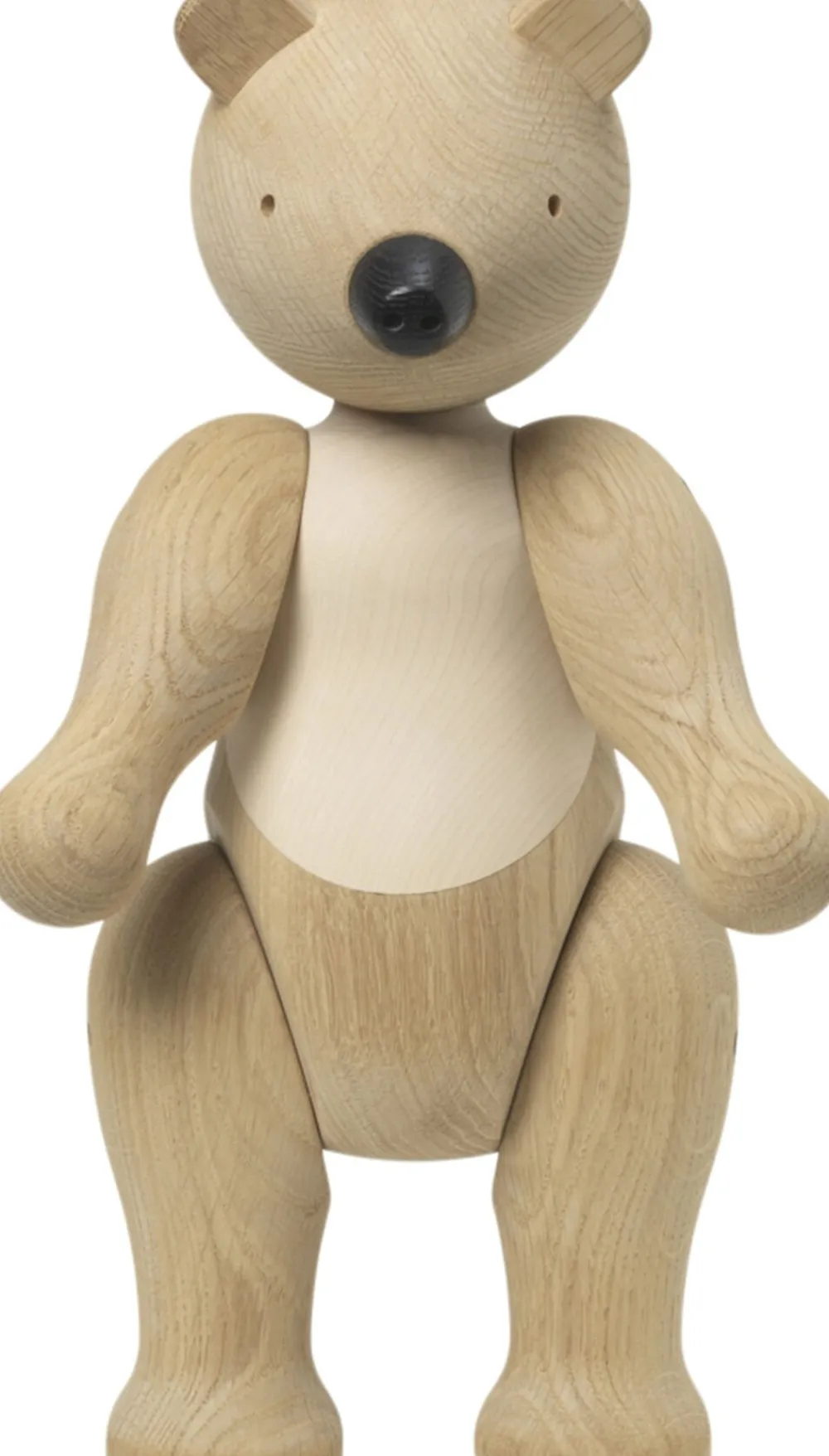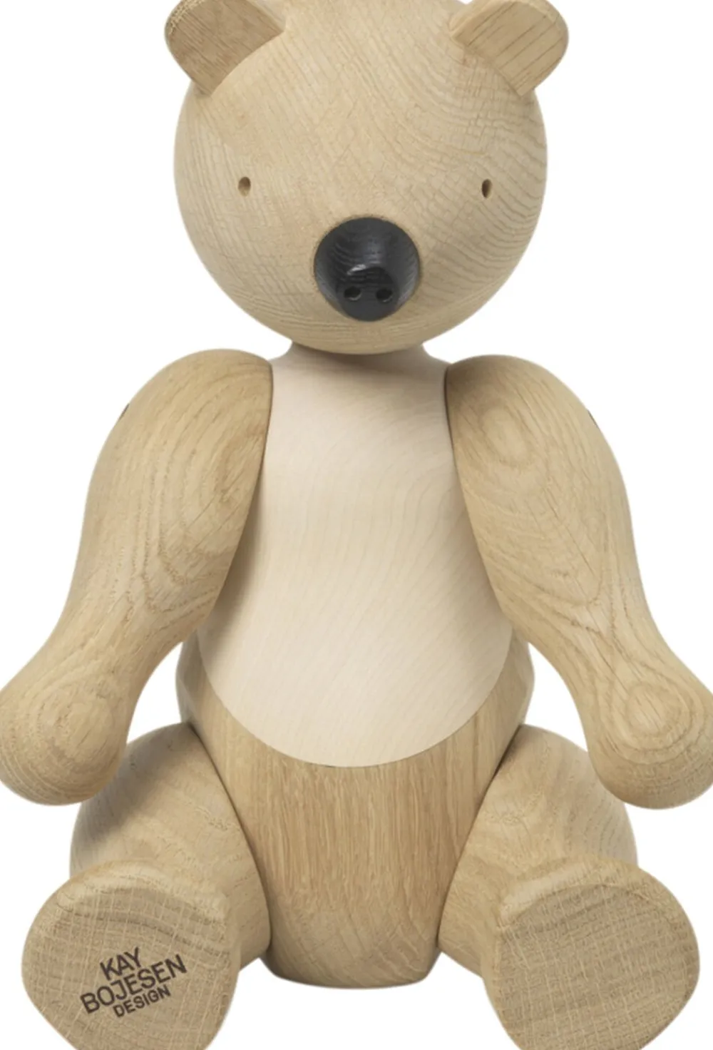 Et stort og stærkt ikon i en endnu større udgave. Kay Bojesens berømte Bjørn i den store variant måler hele 40 cm i højden en størrelse der virkelig giver designet opmærksomhed og lader de venlige, bløde og smilende linjer, som Kay Bojesen er kendt for, komme til sin ret. I denne størrelse står Bjørnen helt klart og enkelt i sit ikoniske udtryk og unikke formsprog. Den store Bjørn er skabt i hånden med kærlighed og omhyggelighed på præcis samme måde som siden begyndelsen af 50erne, hvor Bjørnen kom til verden med sine karakteristiske åbne arme. Bjørnen er skabt i egetræ og ahorn. Træet står ubehandlet og dets iboende liv, åretegninger og karakteristika kommer smukt til sin ret i den store version af Bjørnen, hvor alt er skaleret op. Den store Bjørn er en oplagt gaveidé til alle, der sætter pris på klassisk dansk design uanset om det er til det store jubilæum eller den runde fødselsdag. Bjørnen repræsenterer styrke, mod og tætte familiebånd og minder os om at være tro mod os selv og møde verden med venlighed og et åbent hjerte.
