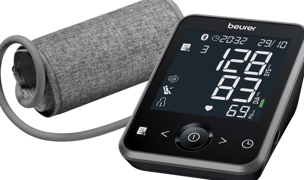 Beurer BM 64 blodtryksmåler til overarm med smart inflationsteknologi, hvor målingen foretages under oppustning af manchetten for et hurtigere resultat.