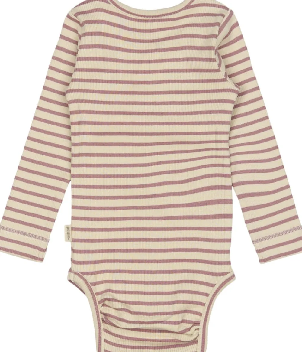 Langærmet bodystocking i vores klassiske stribede rib kvalitet. I venstre side af halsåbningen har vi vores signaturåbning med trykknap for nemt tøjskift. Bodystockingen lukkes i bunden med tre trykknapper, for nemt bleskift. Materialet er blødt og meget strækbart, designet til komfort og leg. Produceret i Indien.