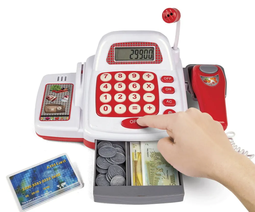 Kasseapparat med tilbehør Med mikrofon. regnemaskine, scanner, kreditkort, penge, indkøbskurv og varer Bruger 3 stk AA-batterier