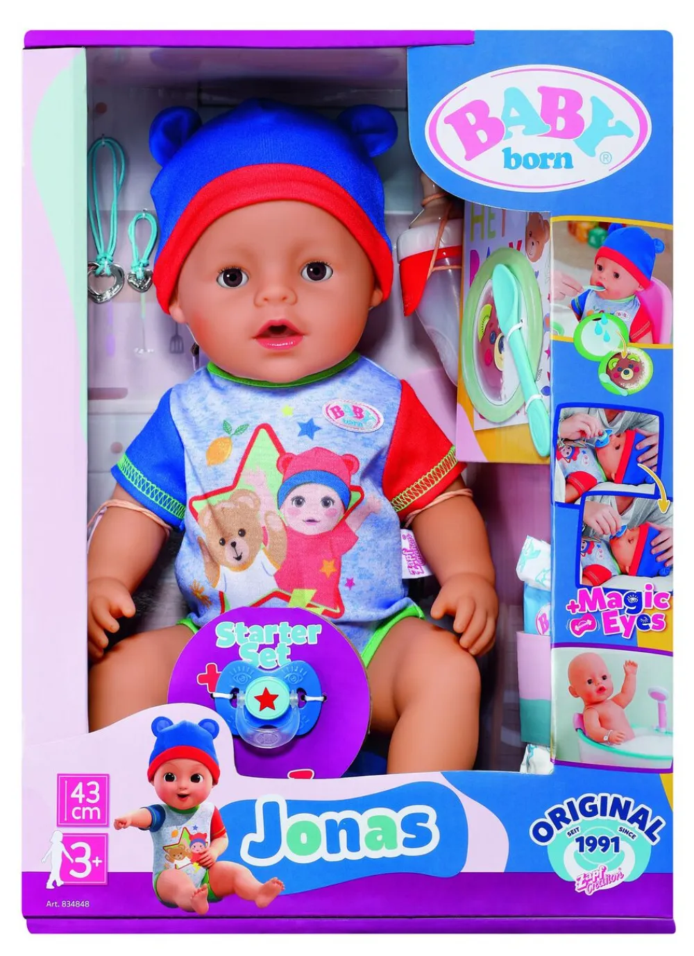 Her kommer Jonas Han har 10 livagtige funktioner Han kan drikke, græde, spise, få skiftet ble og sove på potten, bades og så er han supermobil Et lækkert måltid med en sødt ansigt kommer til syne på den lille tallerken, når den kommer i berøring med vand Potten viser også både småt og stort Du kan lukke Jonas øjne ved at dreje sutten mod venstre, og hvis du drejer den mod højre, åbner han sine øjne Inkluderer: – BABY born Jonas dukke 43 cm inkl sparkedragt og hue – potte (van dmagi), ble, tallerken (madmagi), ske, flaske, magisk sut – fødselsattest – venskabsarmbånd til barn og dukke