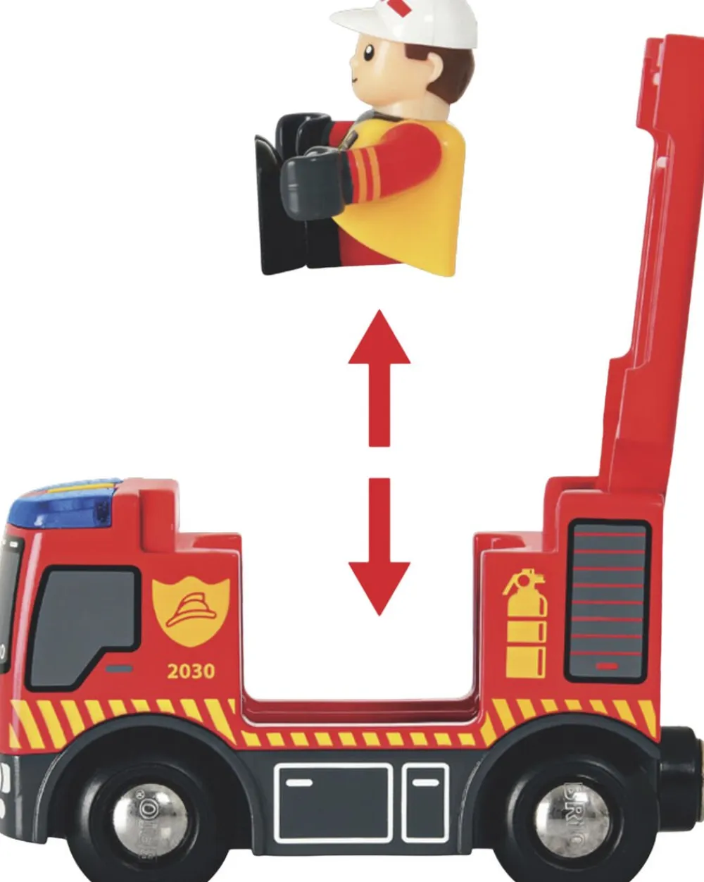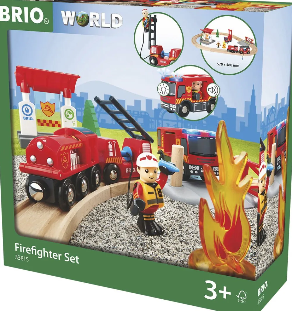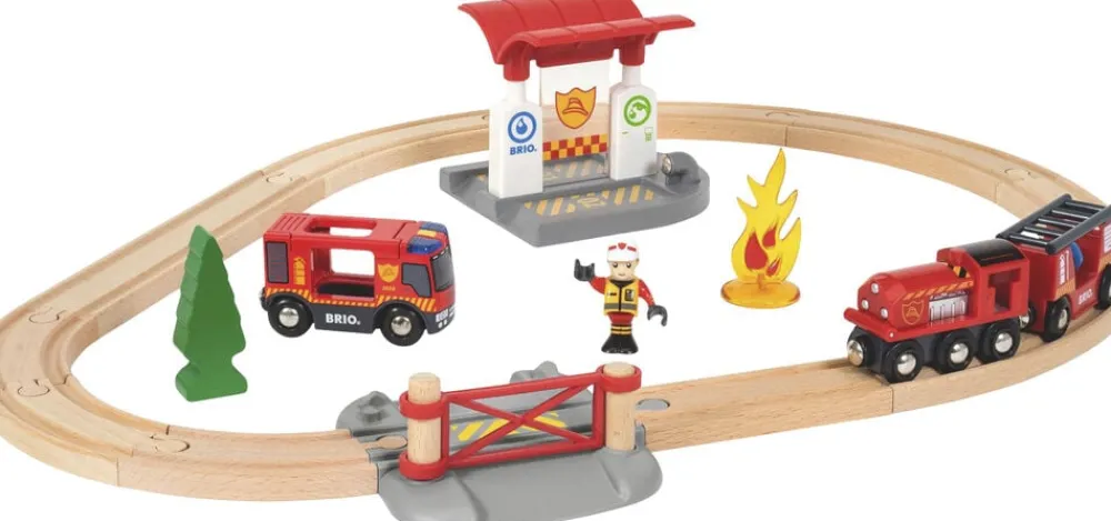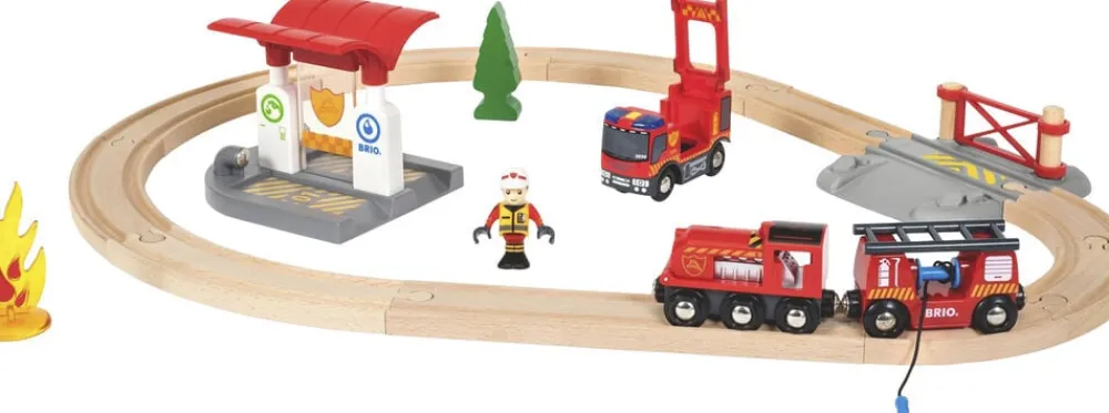 Det brænder. og de har brug for din hjælp! Kør straks til tankstationen og fyld brandtoget med vand og brændstof Brandmanden følger med i sin brandbil med sirener og lys Sluk ilden med brandslangen på vognen Sæt flere BRIO-skinner på for mere action I sættet indgår brandtogvogn med slange, en tankstation, en brandmand. en brandbil med lys og lyd, overkørsel med låge, grantræ, ild og skinner I alt 18 dele Fra 3 år