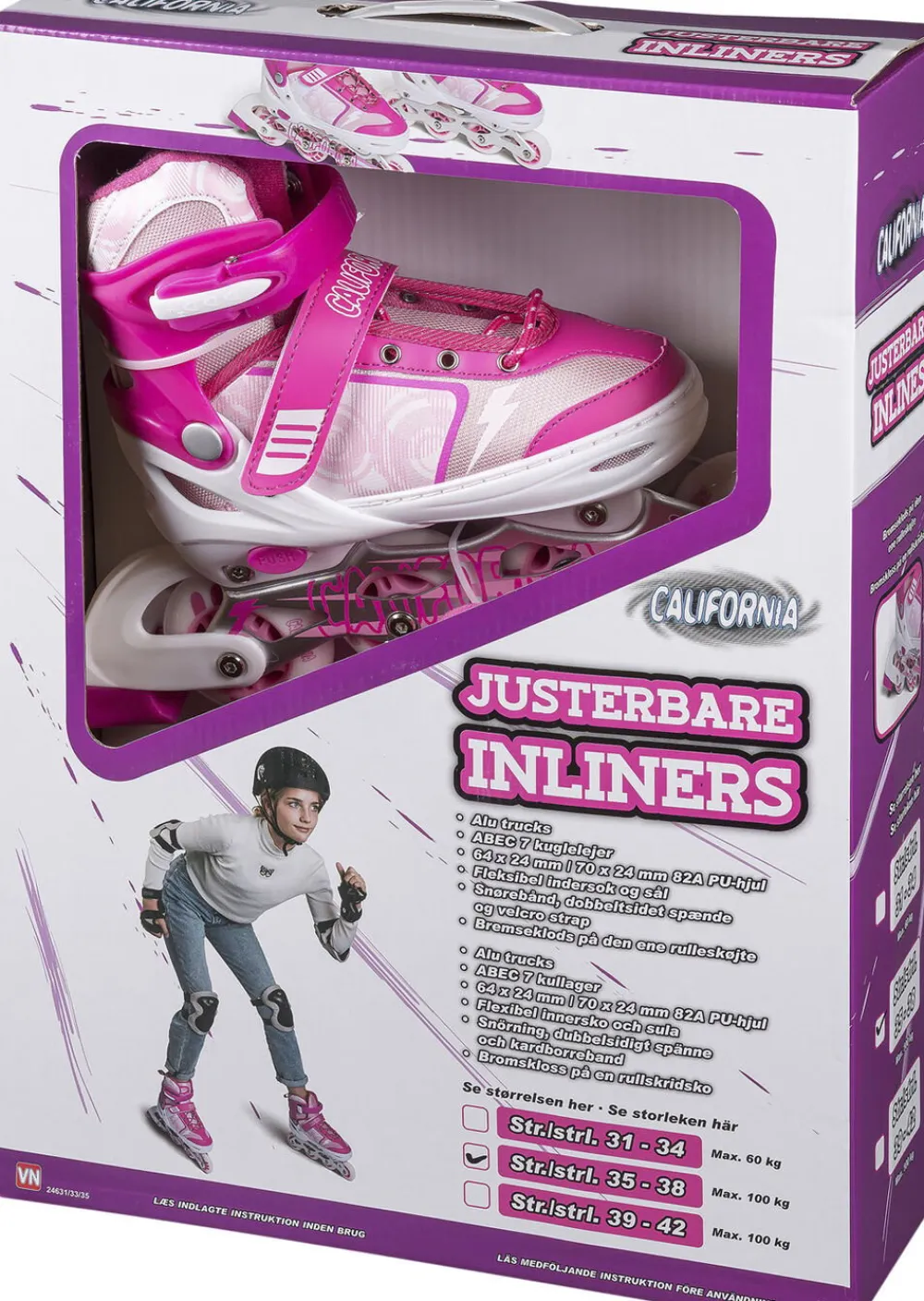 California justerbare inliners pink/hvid Fleksible inliners der kan justeres i størrelserne 31-34, 35-38 eller 39-42 Specifikationer: Alu truck ABEC 7 kuglelejer 82A PU-gummihjul Snørebånd. spænde og velcrostrap Fleksibel indersok og sål Bremseklods 4 størrelser pr skøjte