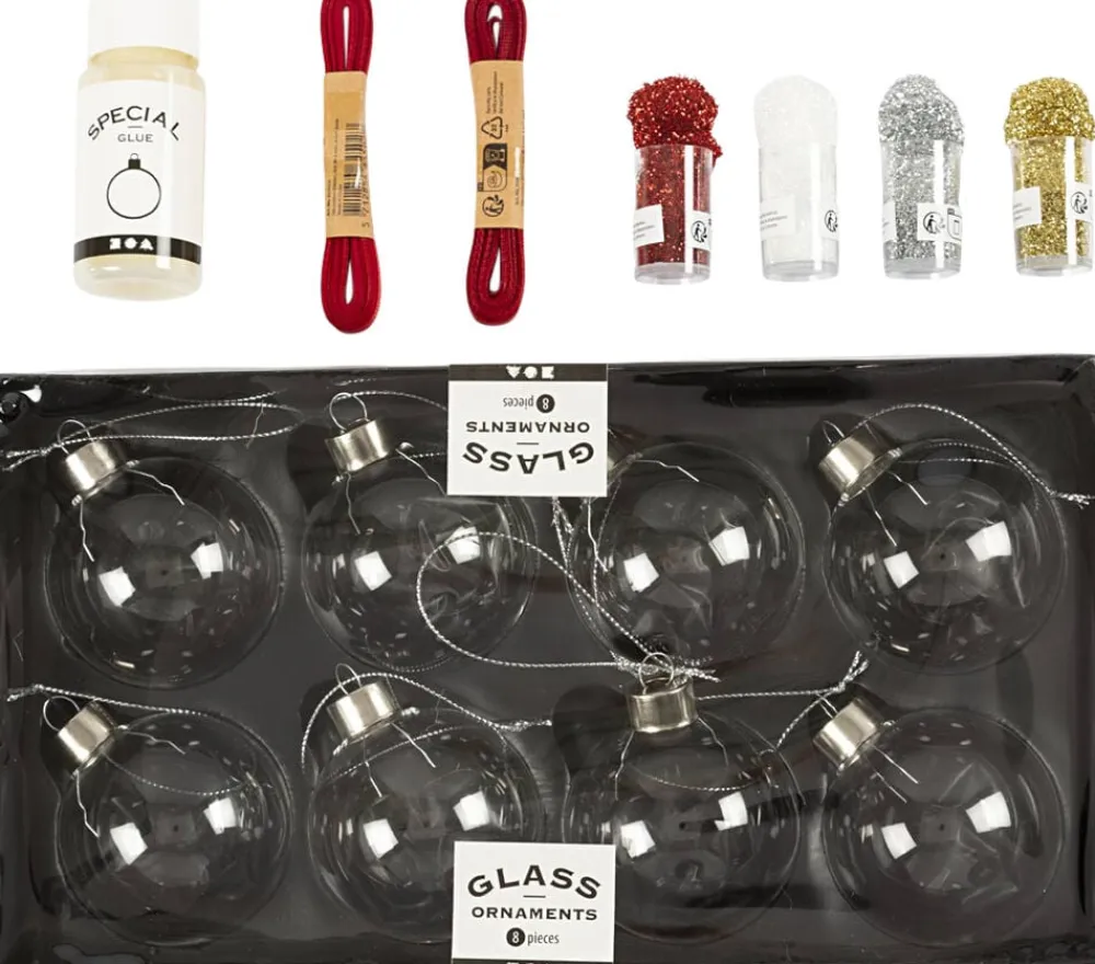 Med dette kit kan du lave flotte julekugler med glitter. Indeholder alle de materialer du skal bruge, og al den vejledning du behøver. Vil du lave magiske julekugler, er dette kit lige noget for dig. Du får materialer nok til otte julekugler i glas. Først dekorerer du med glitteret indvendig og bagefter hænger du dem op med klassisk, rødt bånd. Resultatet bliver de fineste julekugler til juletræet.