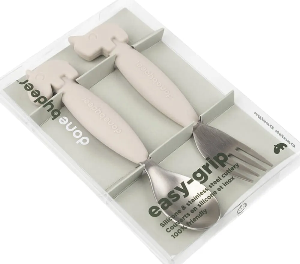 Deer friends bestiksættet med easy grip består af en ske og en gaffel. Easy grip giver et fast greb og hjælper dit barn, så det bliver nemmere at bruge bestik. Det er afgørende at have et godt børnebestik, hvis det skal være sjovt at spise selv. Det søde bestik har bløde anti-slip silikone håndtag, som helt sikkert vil gøre det til et favoritsæt. Størrelsen på børnebestikket er perfekt for en selvstændig tumling, der er ved at lære at spise med bestik. Den sandfarvede Nozo gaffel og Ozzo ske matcher resten af Done by Deers servicekollektion.