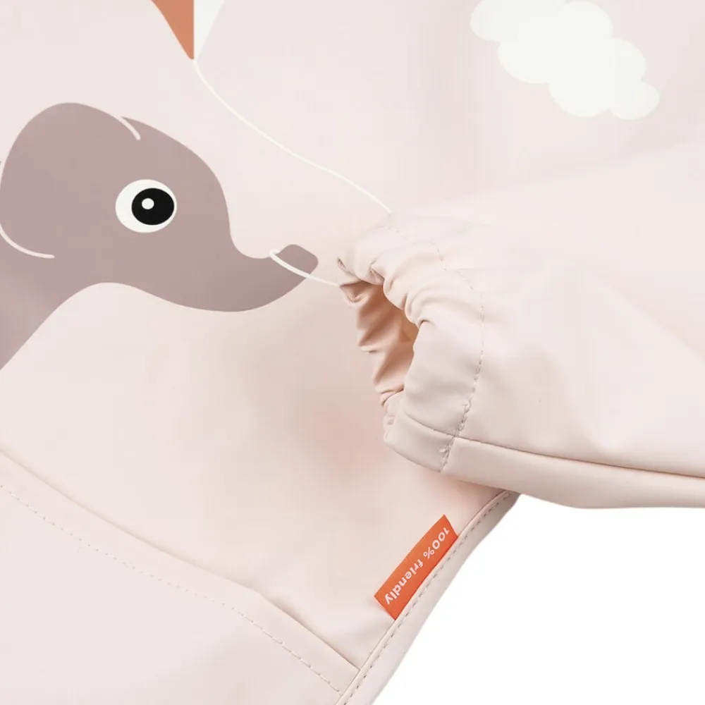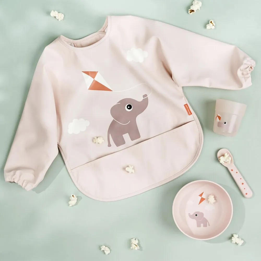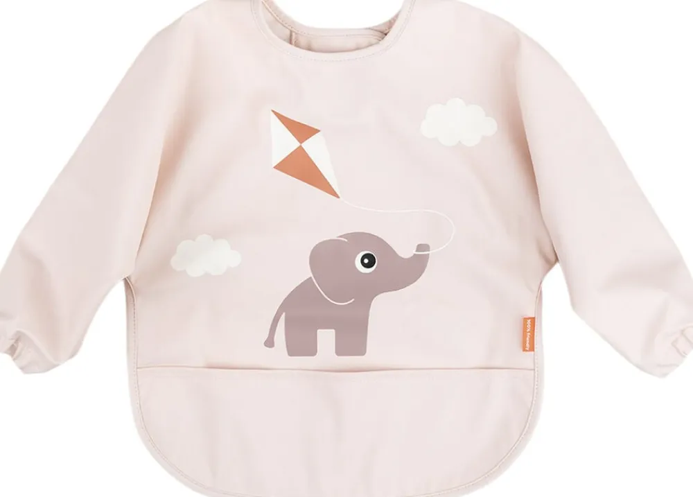Sød, pudderfarvet hagesmæk med motiv af Elphee, der flyver med drage