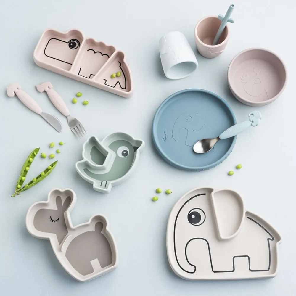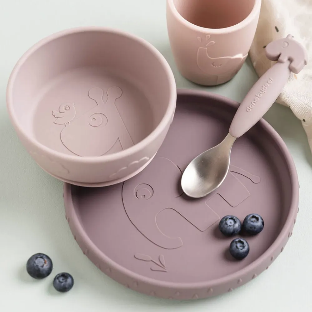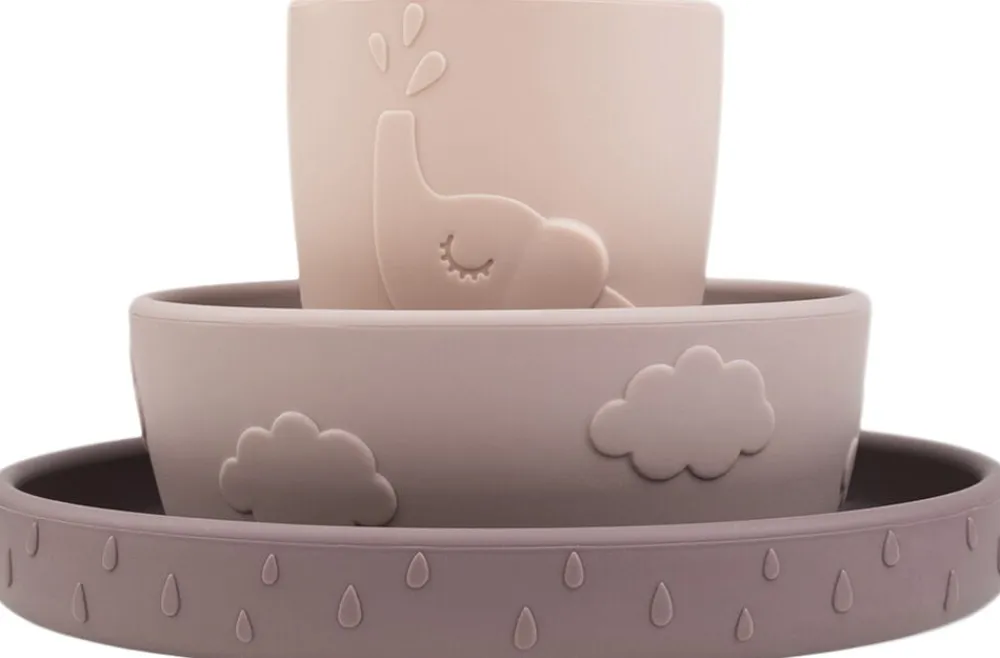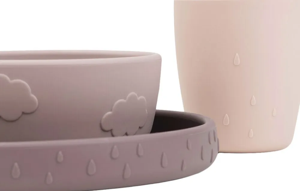 Spisesæt bestående af en tallerken, en skål og en minikop
