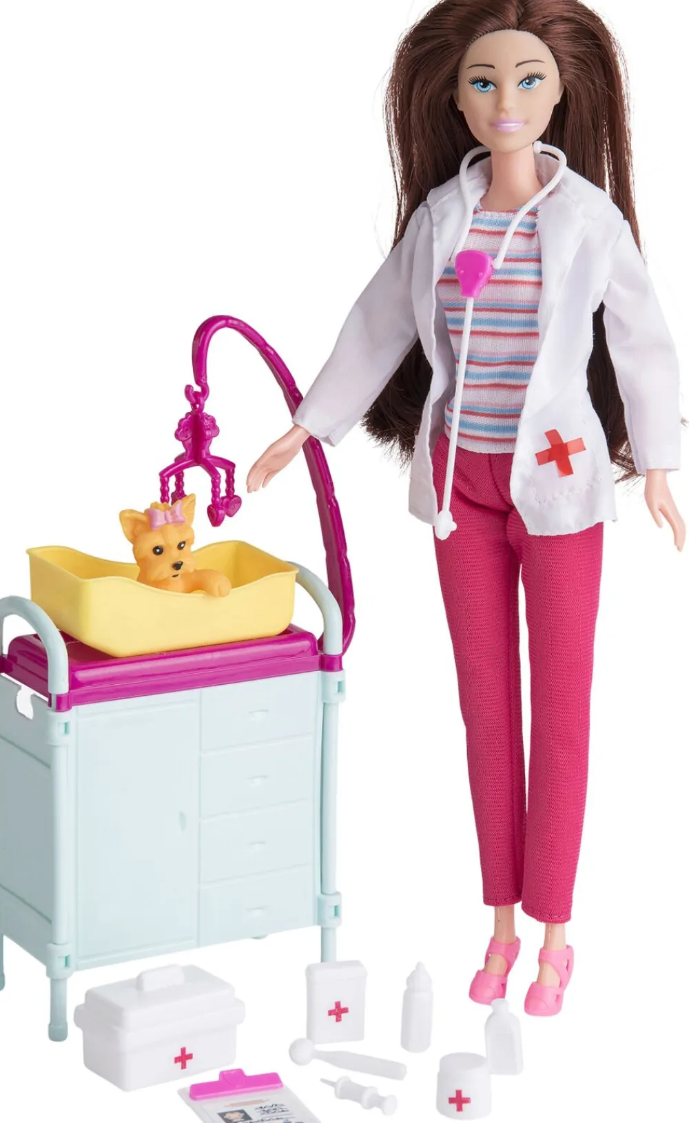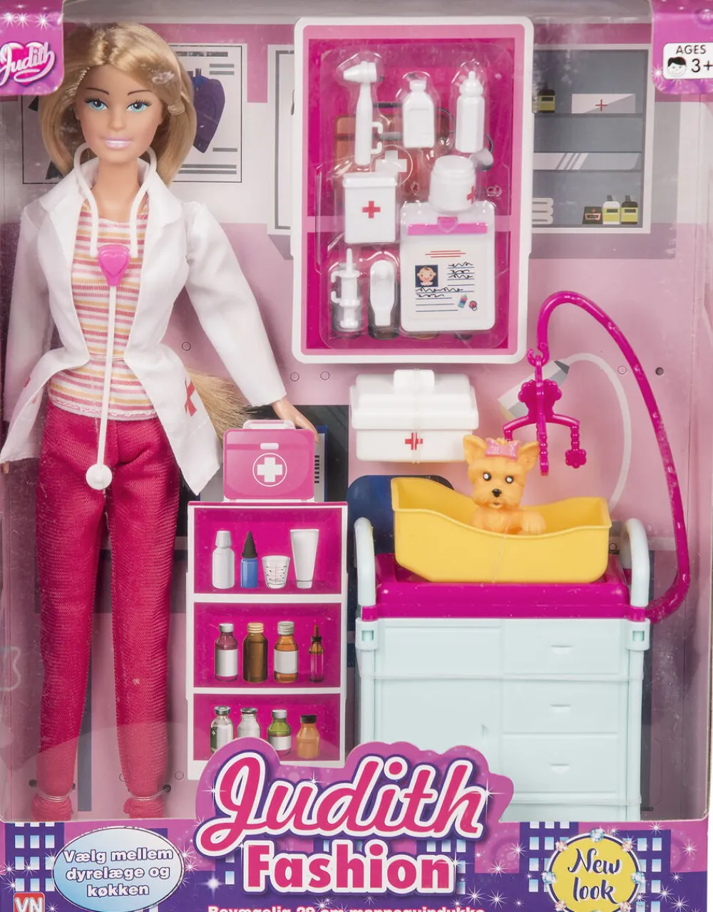 Judith dyrlæge- eller køkkensæt Med dyrlægetilbehør og hundehvalp eller køkken med tilbehør Inkl Judith mannequindukke