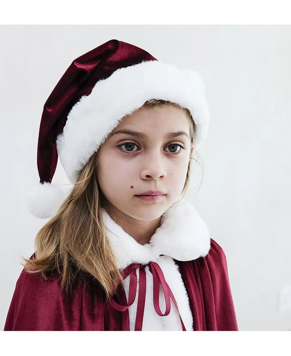 Flot vinrød nissehue med hvide plyskanter og kvast.