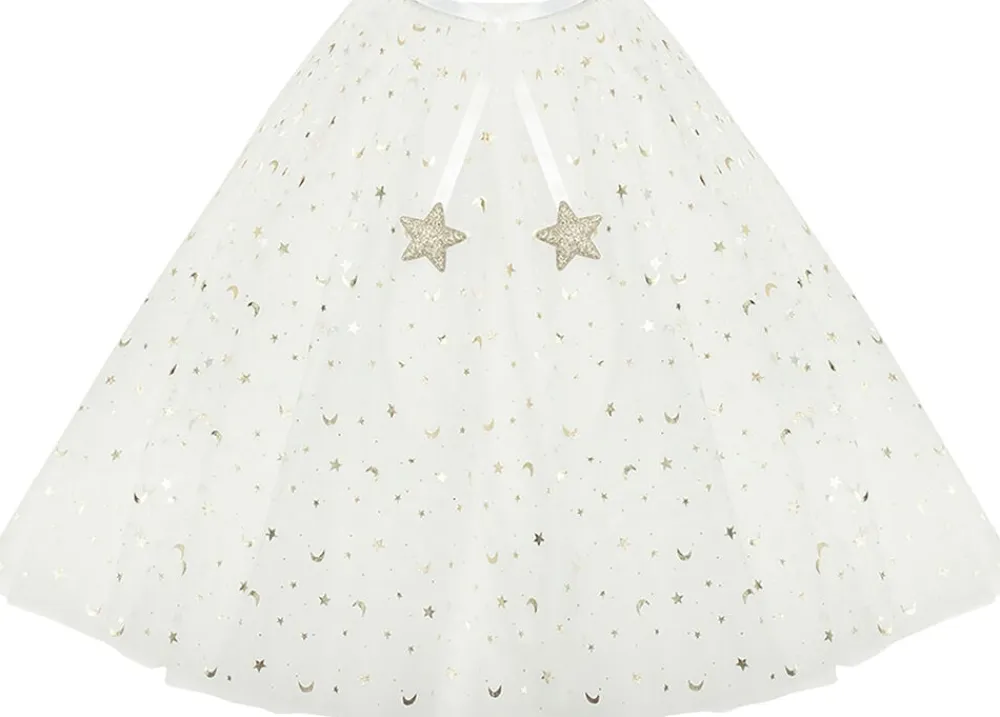 Hvidt tylskørt med små guldfarvede måner og stjerner. Tylskørtet er forsynet med bindebånd i satin med guldfarvet stjernevedhæng.