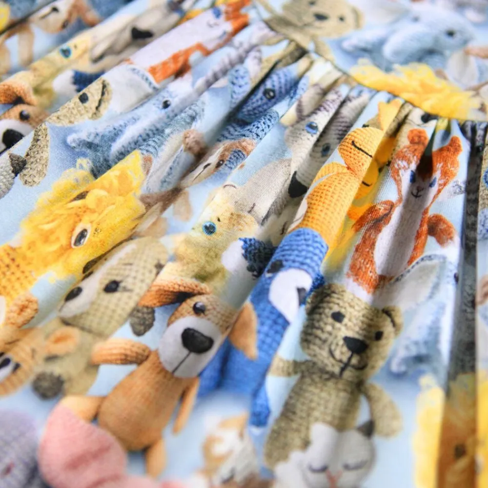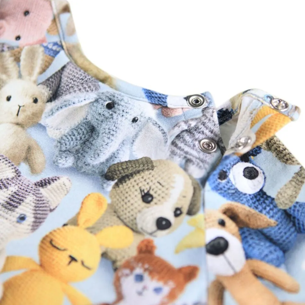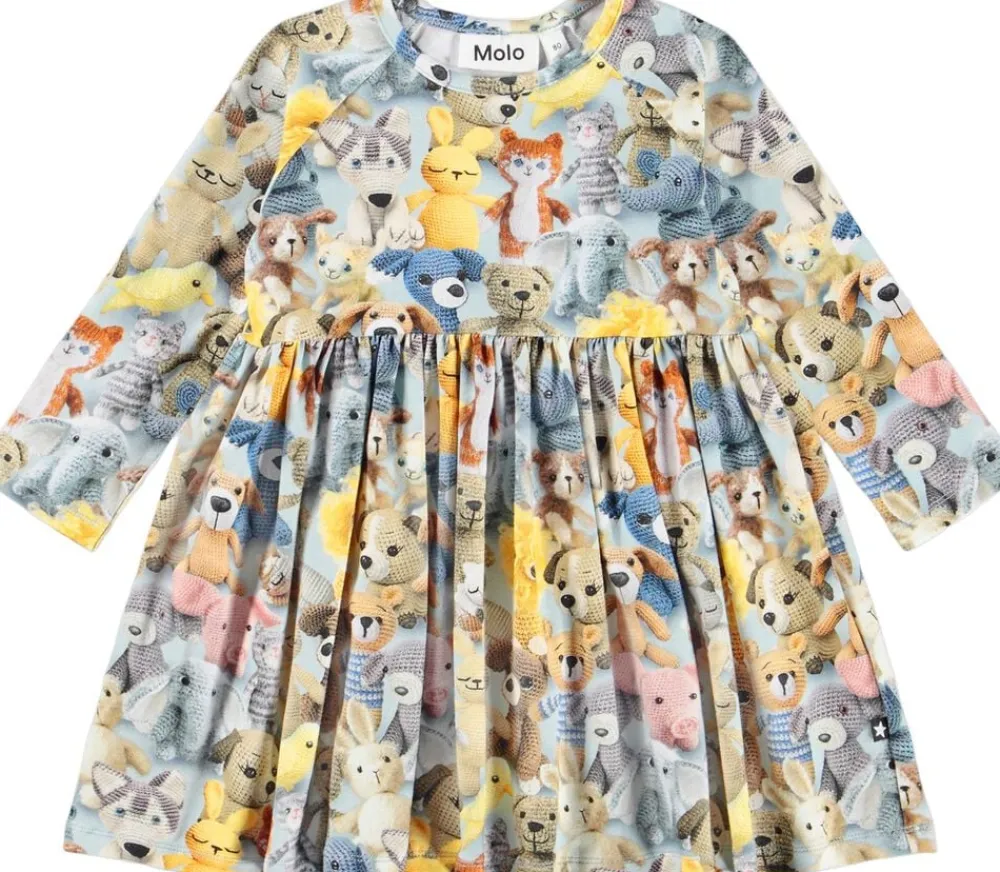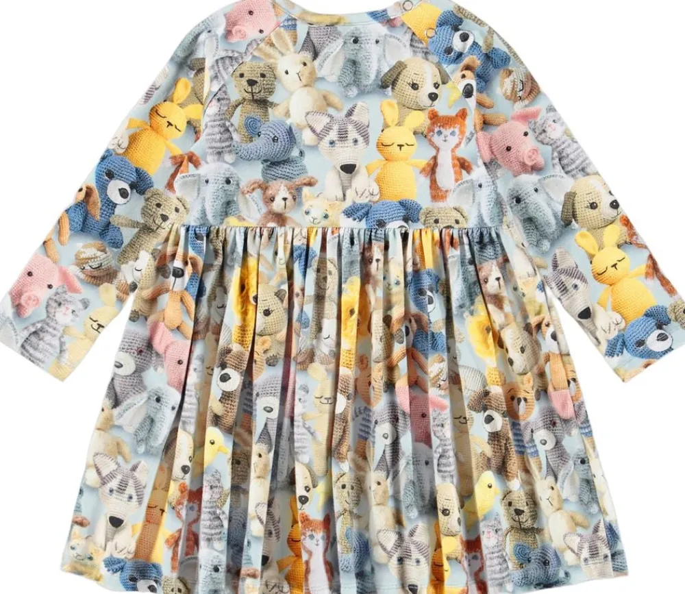 Denne kjole fra Molo er lavet i økologisk bomuldsjersey og har et print af dyr. Toppen har tætsiddende raglanærmer og en rund hals med knaplukning bagpå. Skørtet har rynker, der giver plads til bevægelse.