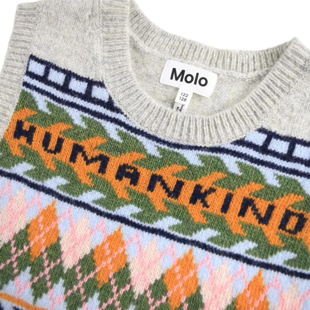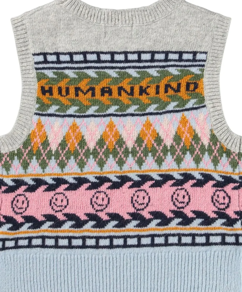 Denne multifarvede strikkede uldvest fra Molo er nordisk inspireret med smilende ansigter og teksten ‘Humankind’ foran og bagpå. Vesten har ribkanter ved halsudskæring, ærmer og bunden.