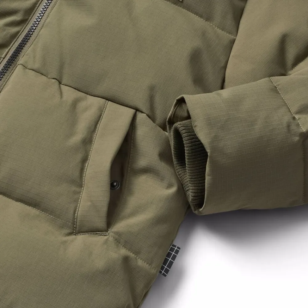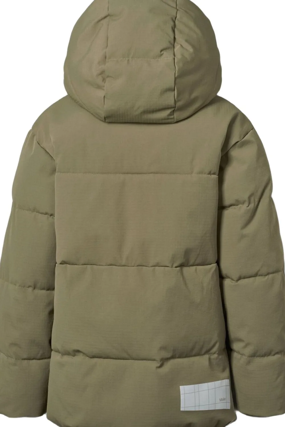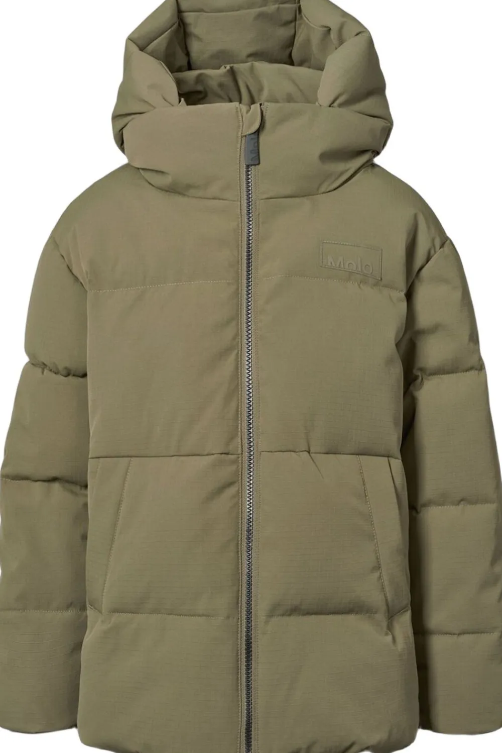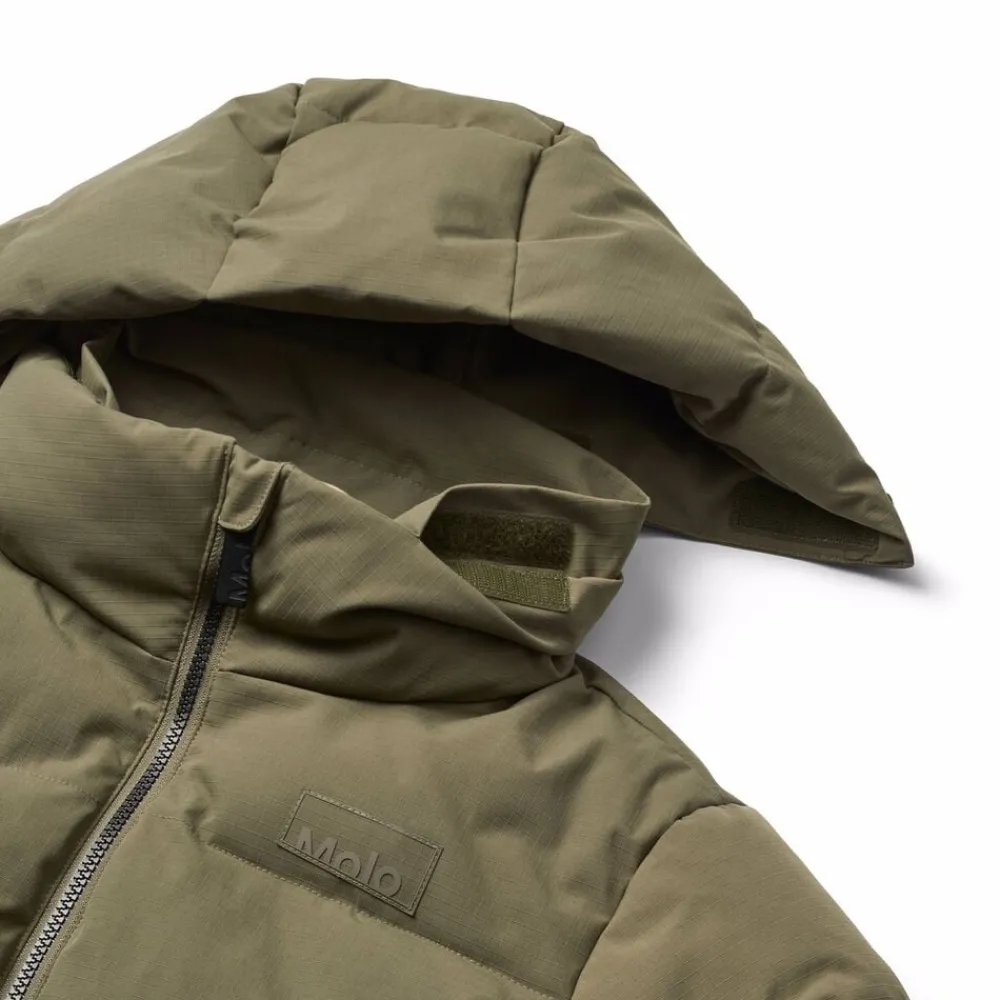 Denne armygrønne jakke fra Molo er lavet i genanvendt polyester og har et print af snowboardere i alperne. Jakken har en praktisk lynlåslukning, høj krave, aftagelig hætte, frontlommer, en indvendig lomme, ribkant ved håndleddene og en justerbar elastik i bunden. Bagpå er der en stor refleks.
