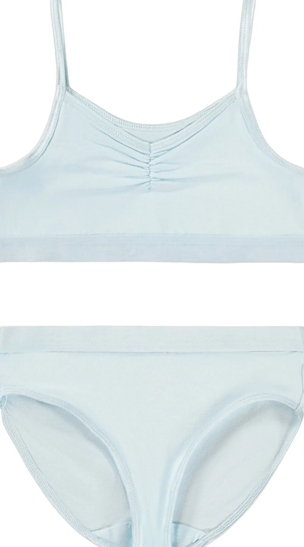 Blødt og strækbart undertøj i viskose, der sikrer optimal komfort hele dagen. Toppen har tynde, elastiske stropper og en rynket søm foran, der tilføjer et stilfuldt snit. Den brede elastikkant på både overdel og underdel sikrer en god pasform, som både børn og forældre vil værdsætte. Ideelt til hverdagens leg og aktiviteter.