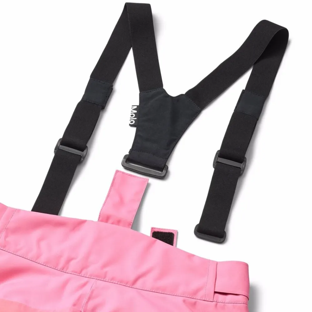 Disse røde overtræksbukser fra Molo er lavet i genanvendt polyester. Bukserne har trykknap- og lynlåslukning, udvendige, justerbare velcro-stropper, bælte stropper til Molos seler (ekstra tilbehør), justerbar benåbning med snefang og ekstra forstærkning mellem benene. Der er vandtætte lommer, refleks bagpå, fleece foret udsatte steder og vatteret med 3M Thinsulate.