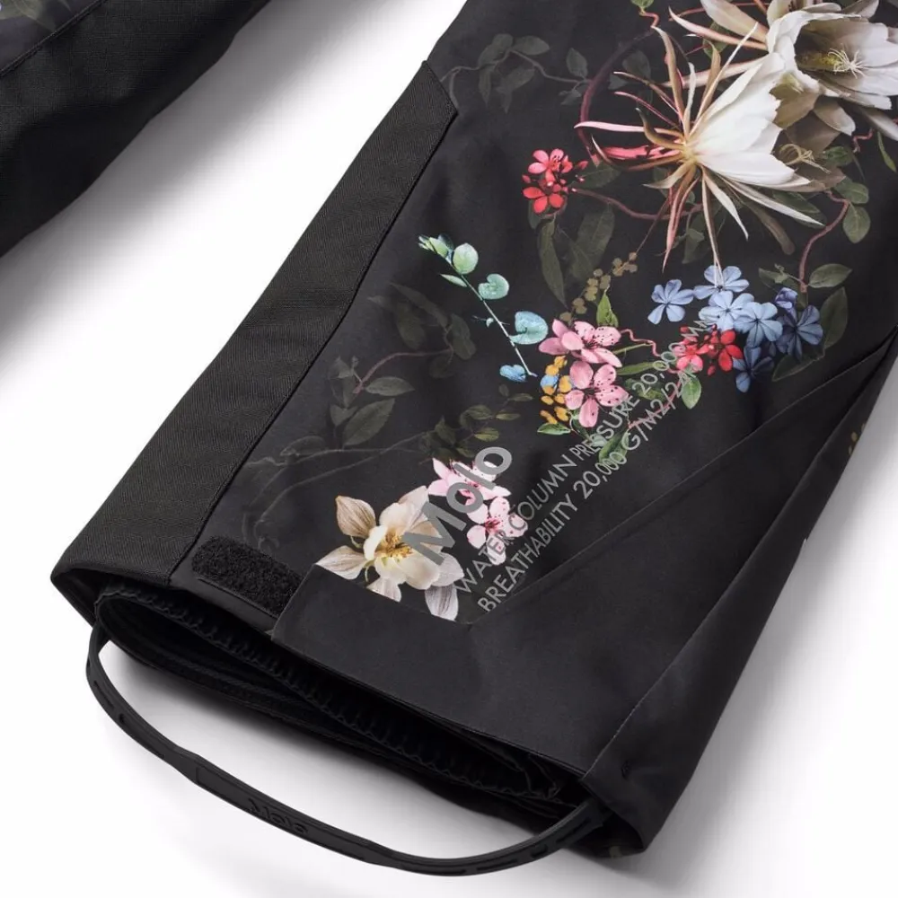 Disse overtræksbukser fra Molo er lavet i genanvendt polyester. Bukserne har trykknap- og lynlåslukning, udvendige, justerbare velcro-stropper, bælte stropper til Molos seler (ekstra tilbehør), justerbar benåbning med snefang og ekstra forstærkning mellem benene. Der er vandtætte lommer, refleks bagpå, fleece foret udsatte steder og vatteret med 3M Thinsulate.