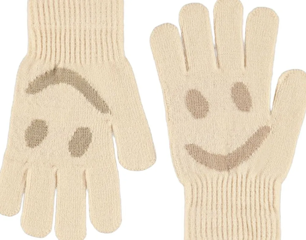 2-pak strikhandsker fra Molo i creme og rød. Det ene par er grå og sort, det andet par er sort med et gråt smilende ansigt.