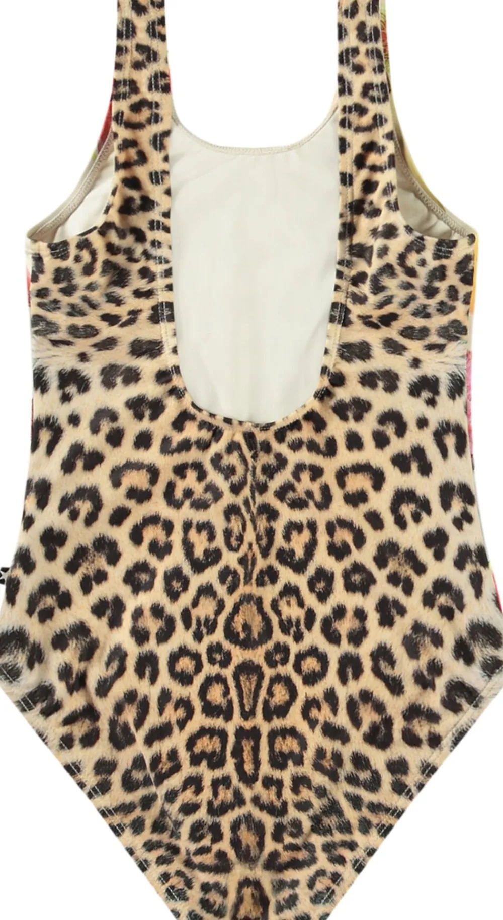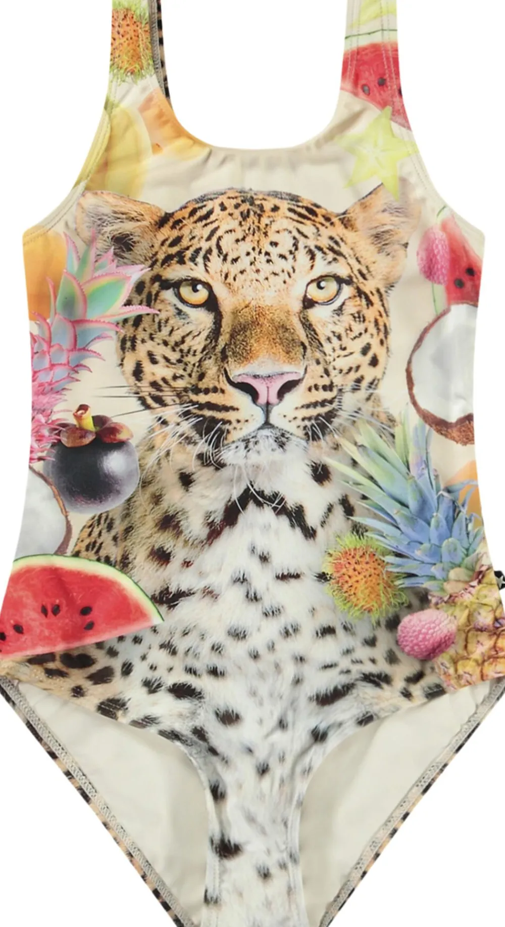 Lyserød badedragt med smilende smiley-print på forsiden. Lavet af genanvendt, elastisk polyester for komfort og nem påklædning. Med en høj UV-beskyttelse på 50+ er den ideel til solbeskyttelse.