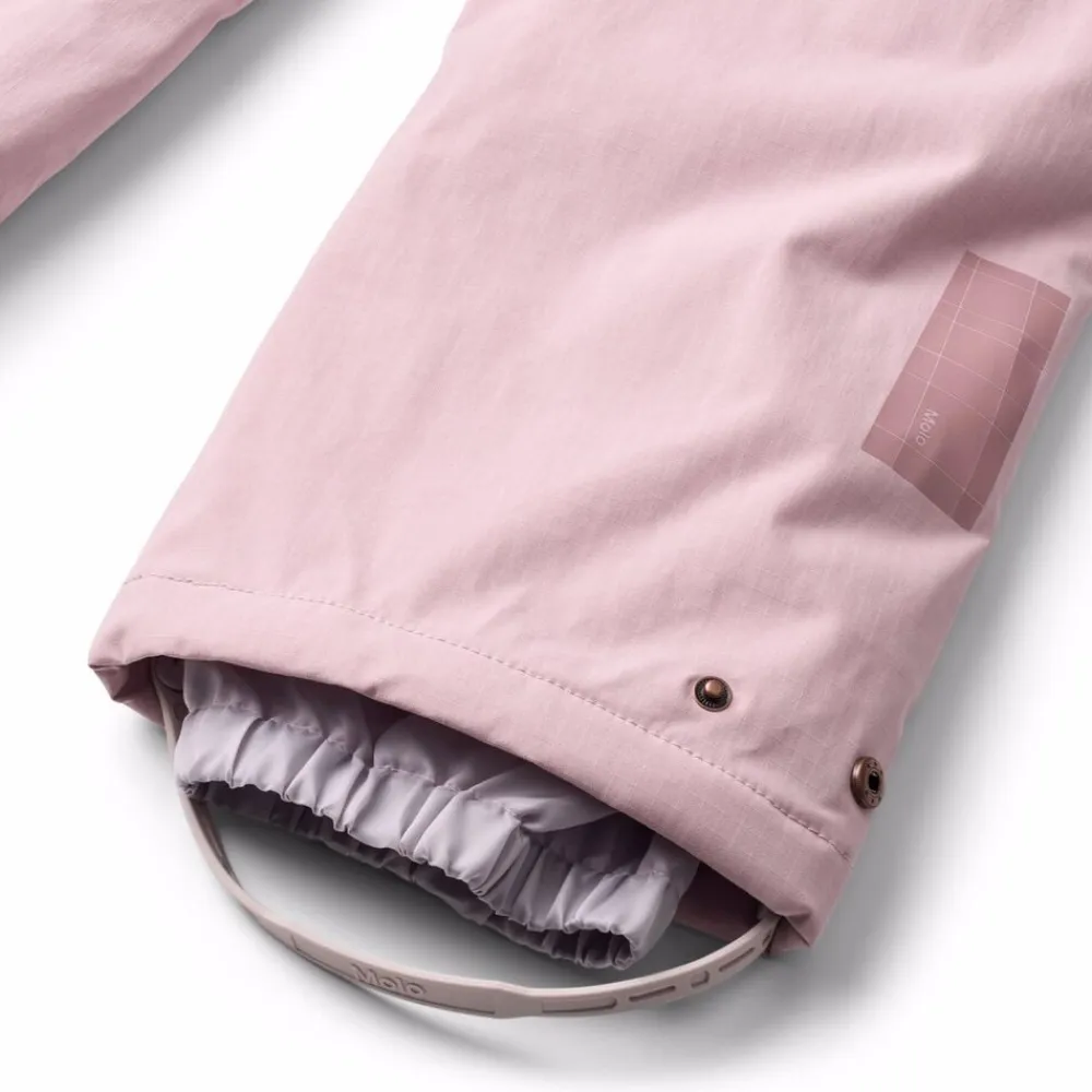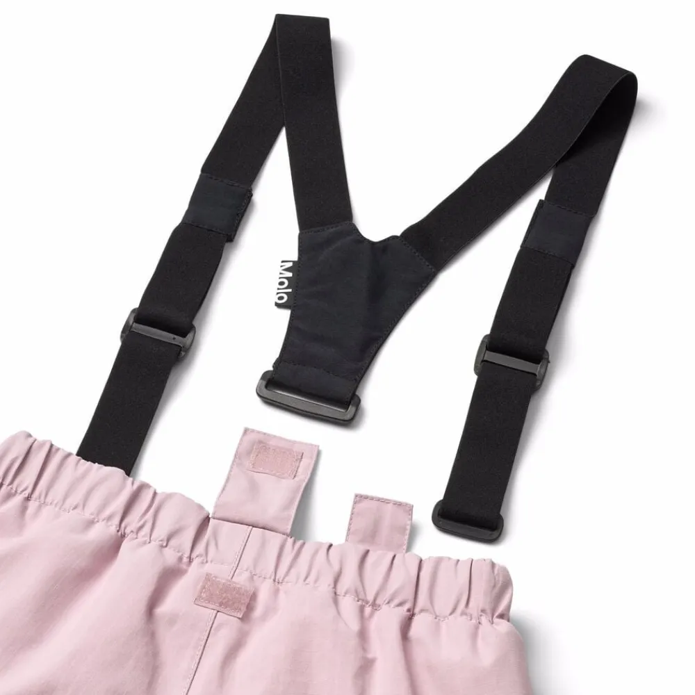 Disse lyserøde overtræksbukser fra Molo er lavet i genanvendt nylon. Bukserne har elastik i taljen, justerbar elastik indvendigt, bæltestropper til Molos seler (ekstra tilbehør) og justerbar benåbning med snefang. Desuden er bukserne udstyret med en stor refleks bagpå.