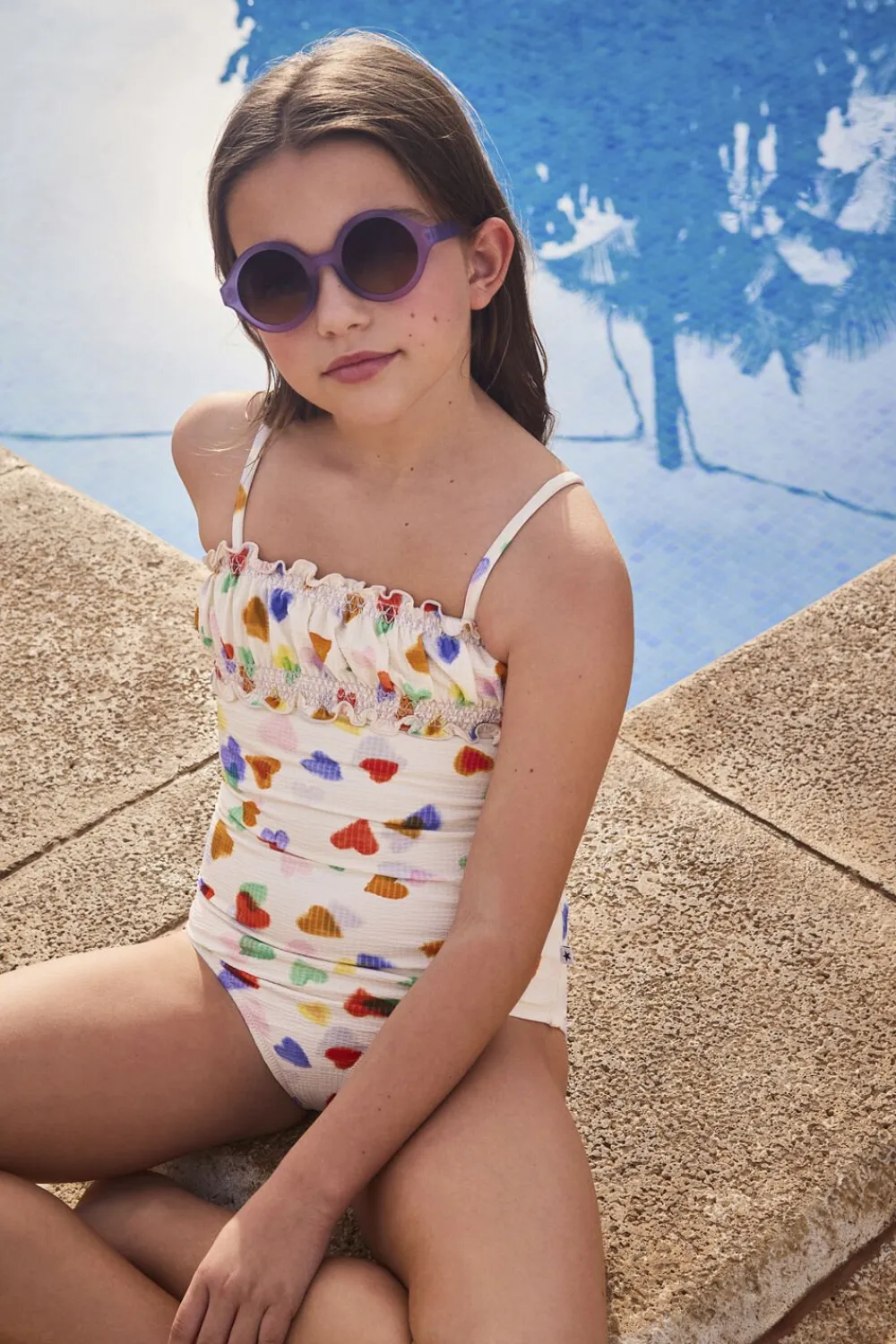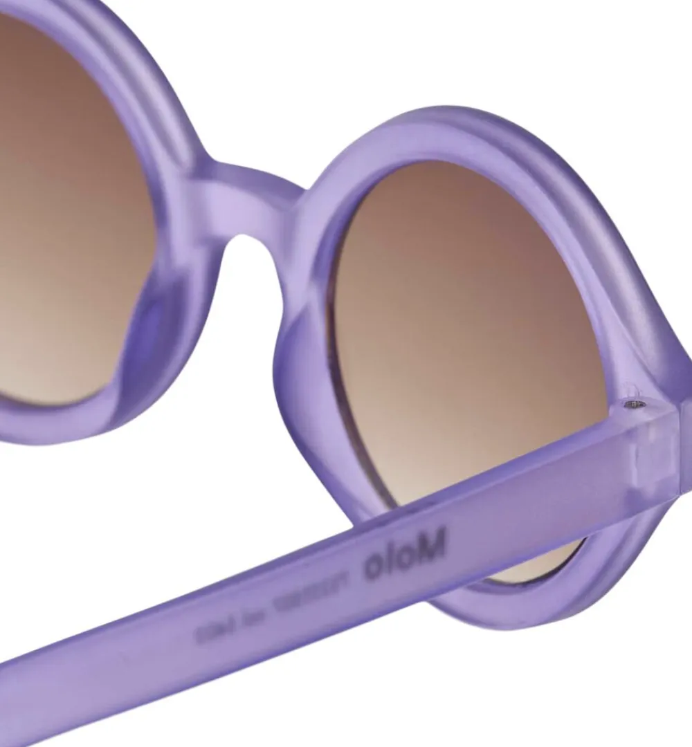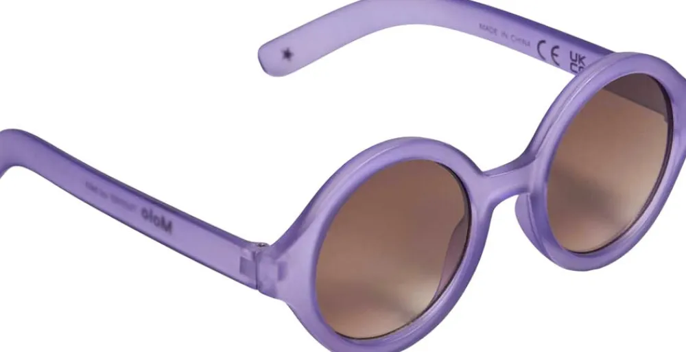 Runde solbriller i lilla med tonede glas og en satineret overflade, der tilbyder 100% UV-beskyttelse. Designet til børn og unge i alderen 7 til 16 år.