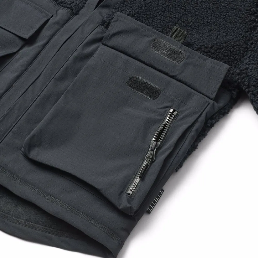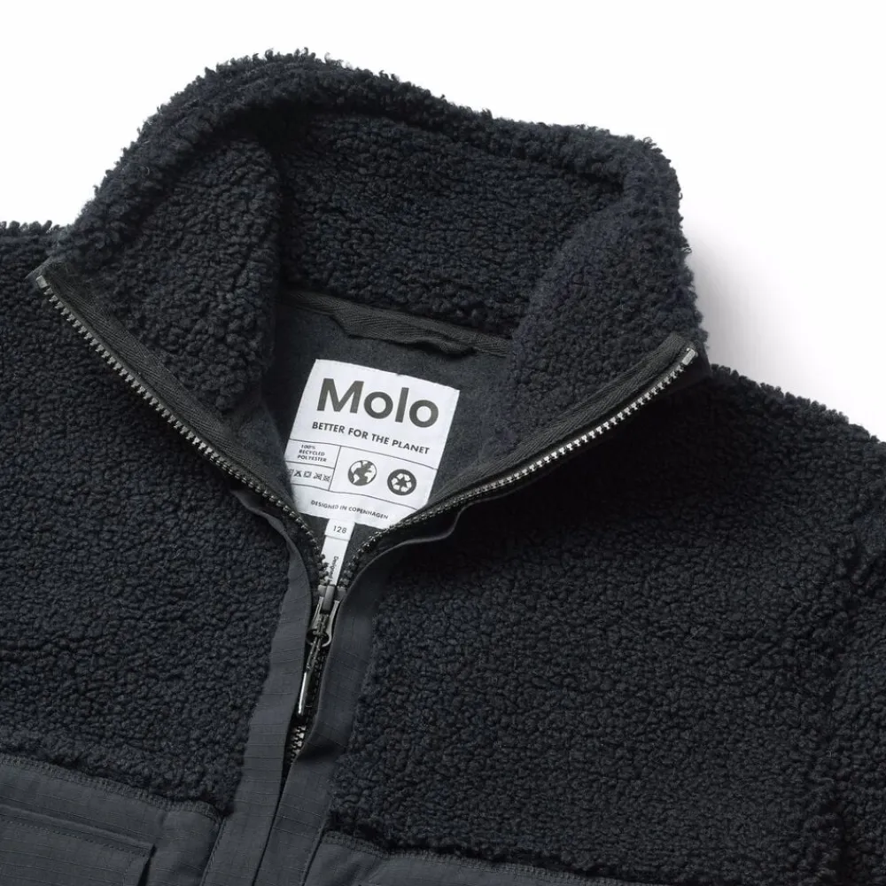 Denne sorte fleecejakke fra Molo er lavet i genanvendt polyester og har vind- og vandafvisende, slidstærke nylonpaneler på ærmer, ryg og frontlommer. Jakken har en høj krave og lynlåslukning på fronten.