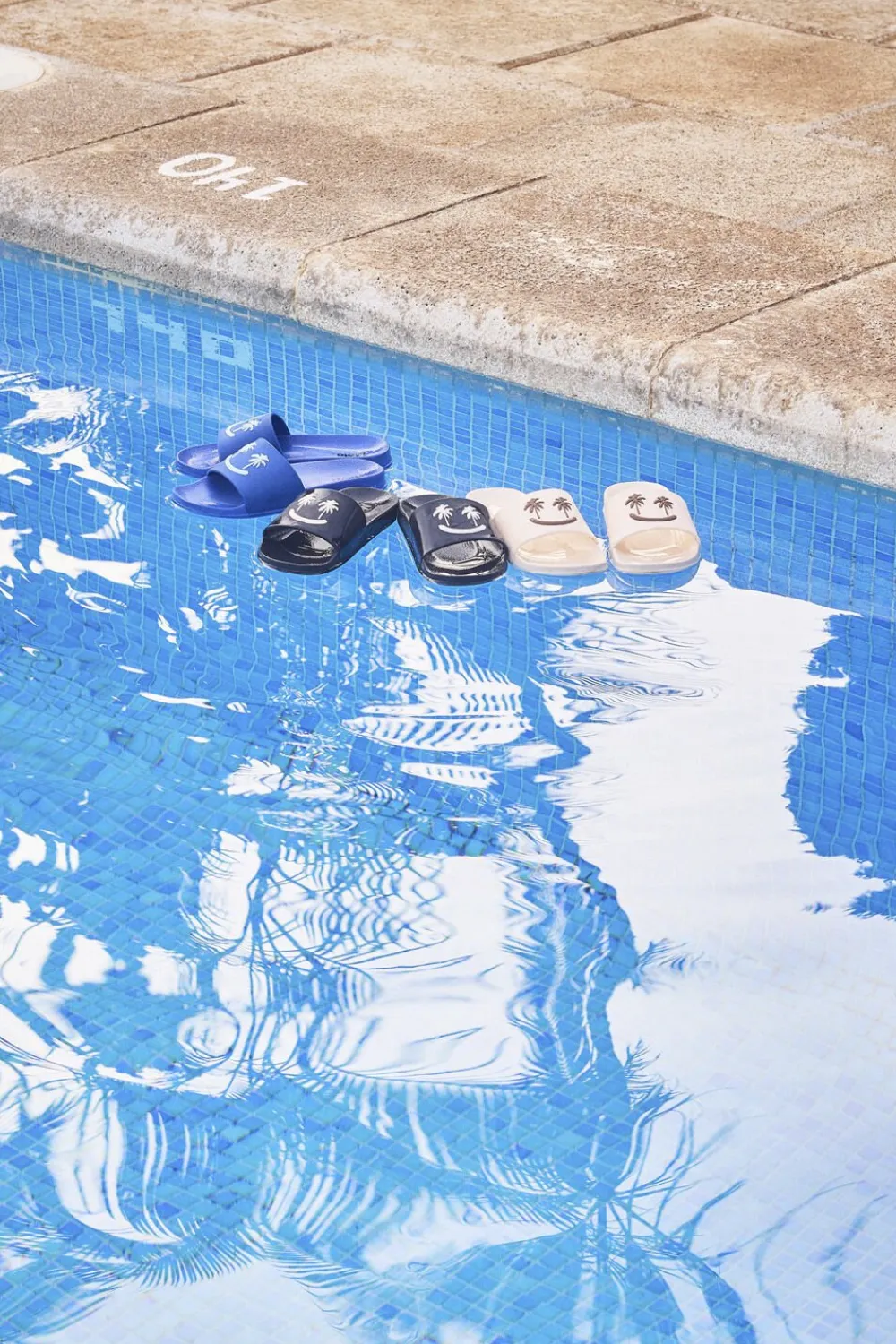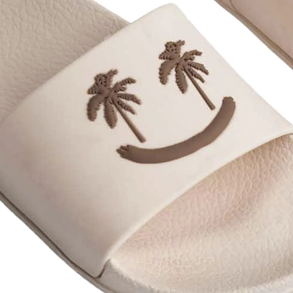 Badesandaler med bred fodrem og formstøbt indersål. Disse sandaler er vandafvisende og ideelle til både poolen og stranden. Fodremmen prydes af et smilende ansigt med palmeøjne.