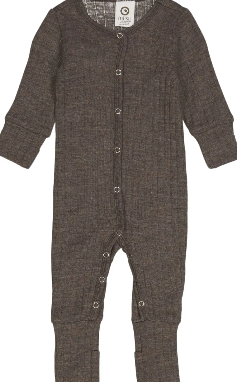Skøn heldragt i blød merinould rib kvalitet. Heldragten lukkes fortil med tryklåse og har vendbare fødder og hænder. Dragten er perfekt til de små for at sikre at de ligger lunt og trygt. De vendbare fødder og hænder kan foldes efter behov. Denne heldragt er fremstillet fra str. 44-74 og passer derfor til meget små babyer. Fremstillet i blød 100 % merinould-rib (GOTS Organic Certified by Ecocert Greenlife Lic. No. 152033). Produktet er GOTS organic- certificeret, hvilket betyder at bomulden er certificeret økologisk, og at der i alle andre processer som farvning, strikning og syning er taget de strengeste hensyn til miljøet. GOTS er internationalt anerkendt som den førende standard for forarbejdning af tekstiler af økologisk bomuld. Derudover tages der også hensyn til arbejdsforholdene, hos dem der producerer tøjet. Økologisk uld 100%