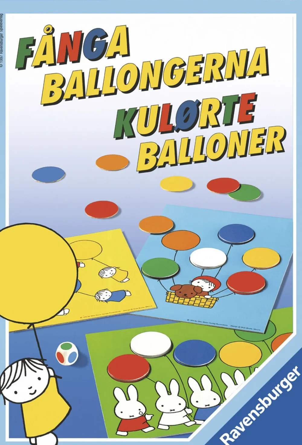 Kulørte Balloner er særdeles velegnet som små børns første spil Ved at spille med de farvestrålende spilleplader lærer børnene de grundlæggende elementer i alle spil – at acceptere spillets regler – at vente på sin tur – at være hensynsfuld over for yngre spillere, som ikke behersker spillet helt – at være en god taber Spillet lærer også børnene at skelne mellem og navngive 6 forskellige farver Illustrationerne er udført af Dick Bruna Indhold 4 spilleplader, 24 ballonbrikker i forskellige farver, 1 farveterning Fra 3 år 2-4 spillere Spilletid Ca 10 min