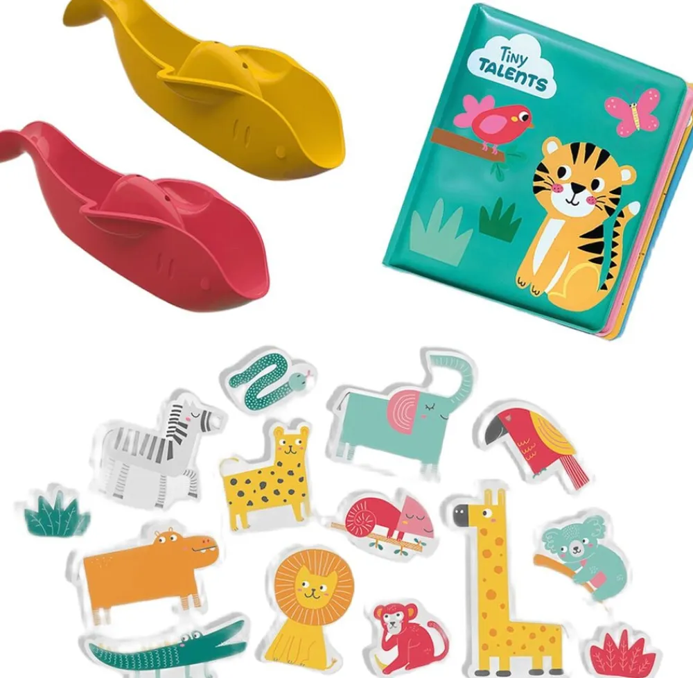 Gør badetiden til en leg med dette sjove sæt, som indeholder en sjov badebog med 8 sider fulde af magiske billeder, der kommer til synes, når bogens sider bliver våde, og dernæst 14 muntre skumfigurer af safaridyr, der kan flyde i vandet eller klæbe sig fast til fliserne på badeværelset. Endelig indeholder sættet to fiskeformede badebåde, perfekt til at sejle med, øse, hælde og lege.