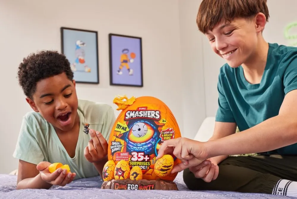 Gør dig klar til et Jurassic-eventyr med Smashers Egg Hunt Kom ikke for tæt på disse ildspyende skabninger tilføj blot vand, og få en dampeffekt Bring din din o til live med lys og lyde ved at placere øjet inde i dens mave og få den til at brøle Grav gennem sand og slim for at finde alle dinodelene Der er 35 overraske lser indeni To brølende Smashers dinosaurer til at samle på