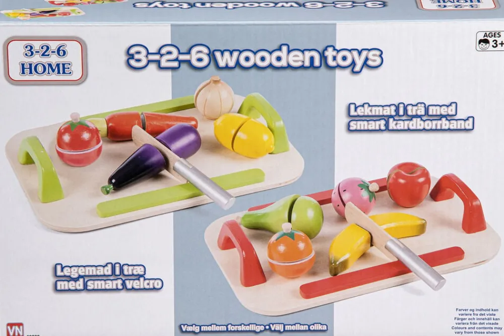 Bakke med træmad med velcro Med kniv så du kan skære maden ud og derefter samle den igen Vælg mellem frugt- eller grøntsæt