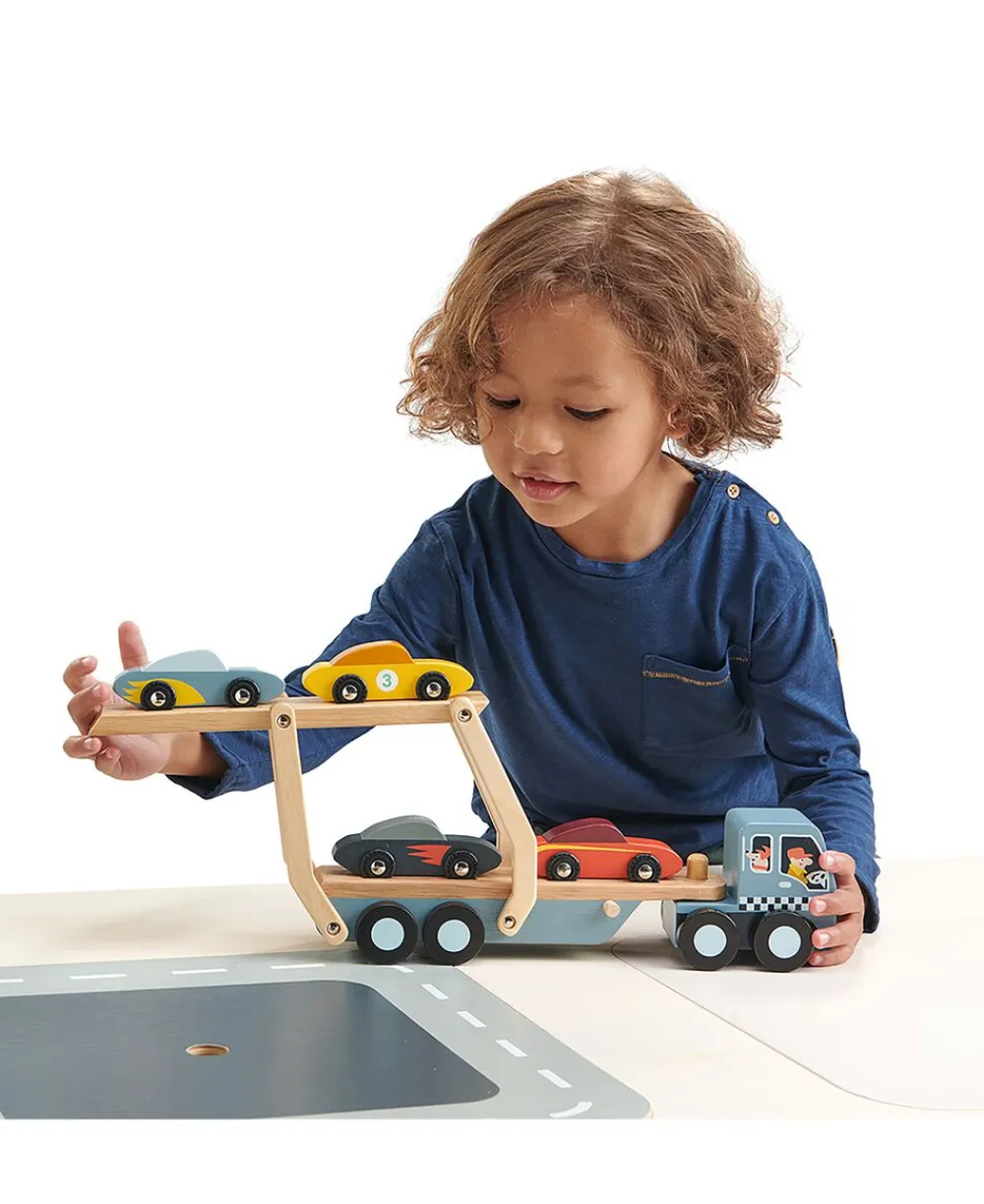 En solid biltransport i træ med aftagelig anhænger og bevægelig rampe, så de fire medfølgende racerbiler kan køre af og på.
