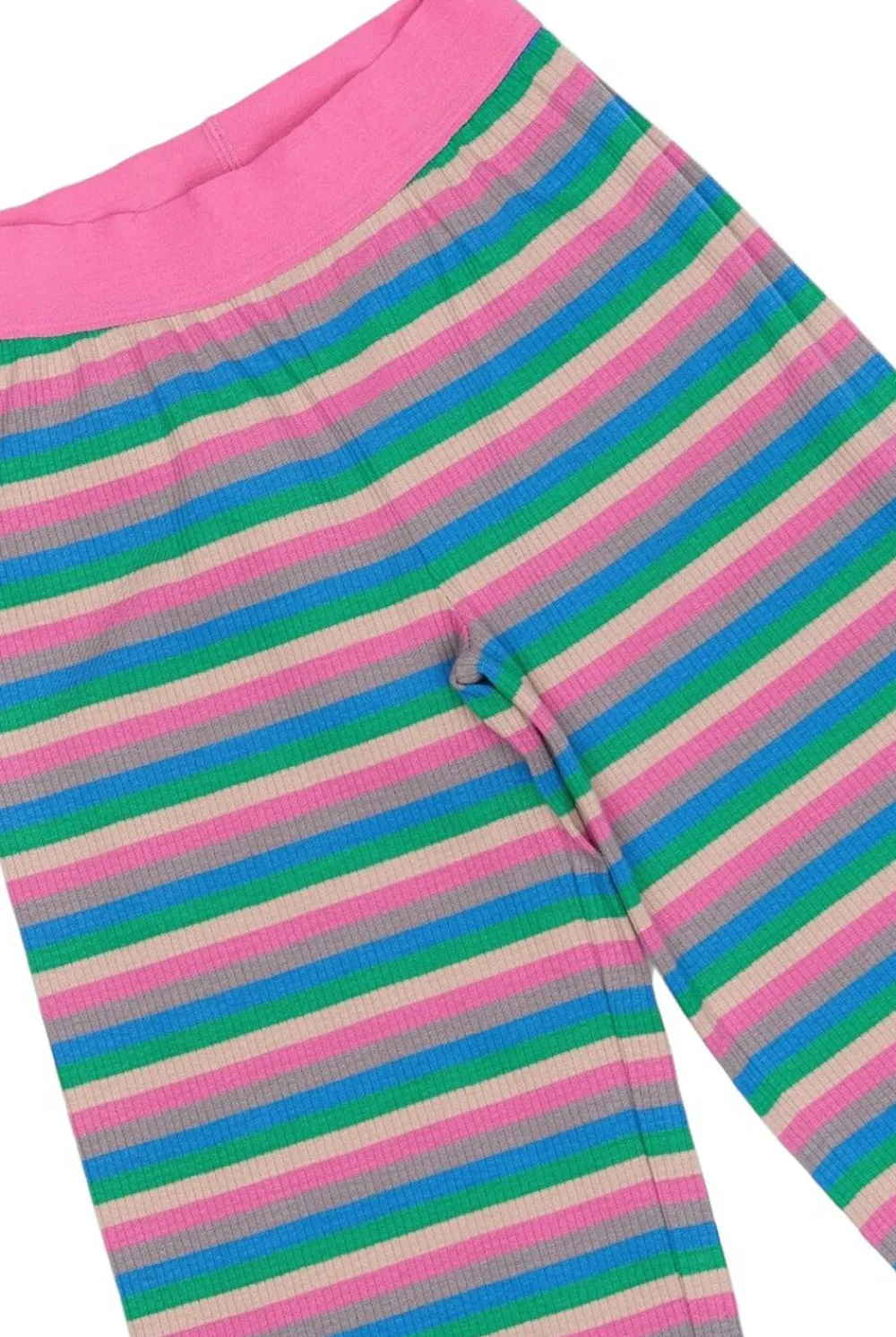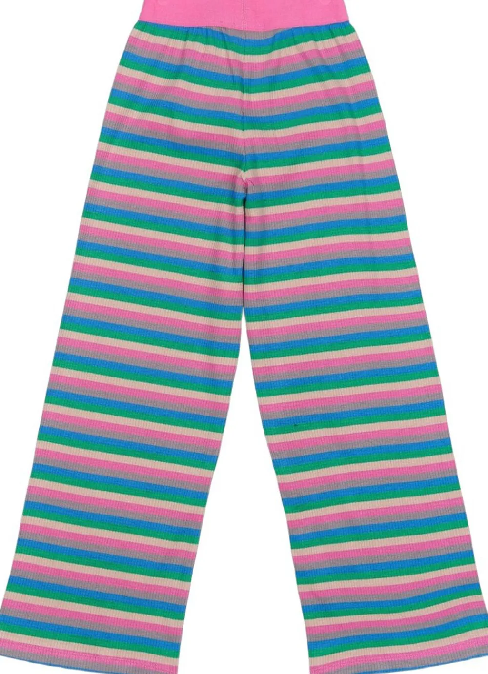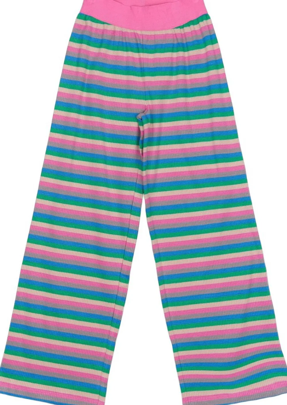 Disse stribede wide-leg bukser fra THE NEW har et legende og farverigt mønster i nuancer af pink, grøn, lilla og blå. De er lavet af et blødt ribbet materiale, der giver både komfort og stil. Den høje talje er afsluttet i en kontrasterende pink farve, hvilket tilføjer komfort til det sjove og livlige design. Bukserne er perfekte til hverdagsbrug og giver en afslappet pasform og et ubesværet stilfuldt look. De kan styles sammen med den matchende TNPiper rib tee for et koordineret sæt eller bruges alene for et farverigt indslag i din garderobe. – Wide-leg pasform – Blødt ribbet stof – Elastisk høj talje – Multi-farvet stribet mønster – GOTS Organic certified by CU842535