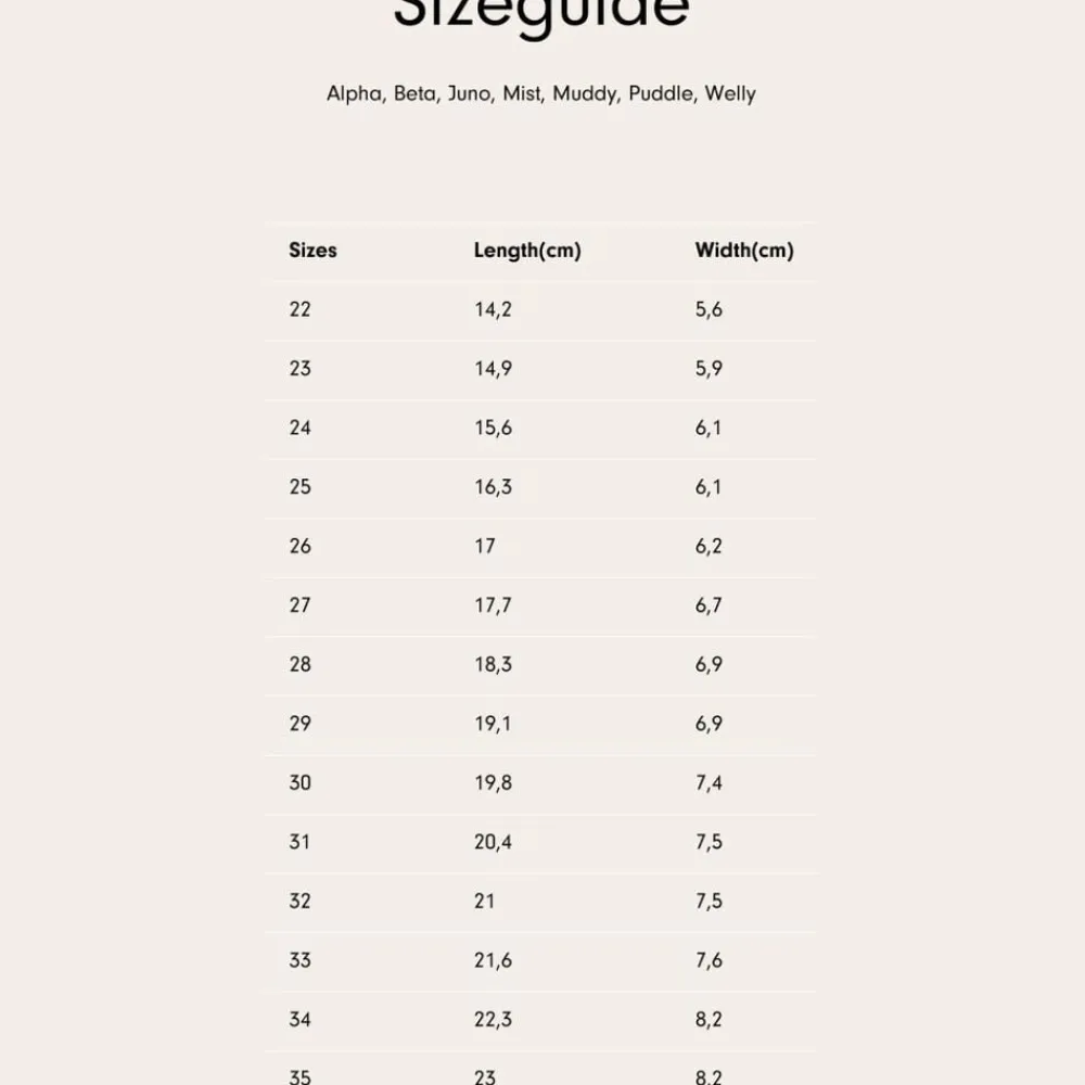 Simple gummistøvler med højt skaft, lavet af naturgummi til børn. – Højt skaft – Ydersåler dækker tæerne for ekstra beskyttelse – Naturgummi – Genanvendt polyesterfoer – Logorefleks bagpå – Findes med Wheat signaturprint Wheat’s klassiske gummistøvler er lavet af naturgummi og bør altid være en fast del af dit barns garderobe. Gummistøvlerne har et enkelt design med aftagelige indlægssåler og Wheat-logo som refleks på bagsiden. Ydersålen er lavet til at dække tæerne for at give ekstra beskyttelse, når dit barn leger udendørs. De er normale i størrelsen og er nemme for dit barn at komme i. Anbefalet voksetillæg: 1-1,5 cm Vejl. Indvendige mål: Størrelse 22 = 14,8 cm Størrelse 23 = 15,5 cm Størrelse 24 = 16,1 cm Størrelse 25 = 16,7 cm Størrelse 26 = 17,4 cm Størrelse 27 = 18,2 cm Størrelse 28 = 18,8 cm Størrelse 29 = 19,5 cm Størrelse 30 = 20,1 cm Størrelse 31 = 20,8 cm Størrelse 32 = 21,5 cm Størrelse 33 = 22,1 cm Størrelse 34 = 22,8 cm Størrelse 35 = 23,4 cm — Ydermateriale: Naturgummi For: 100% Genanvendt polyester Ydersål: Naturgummi