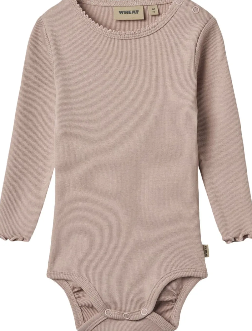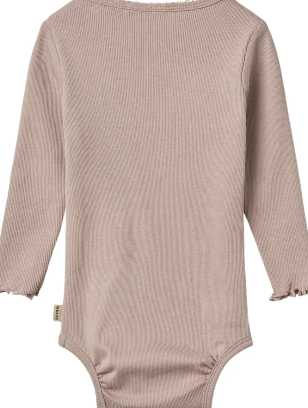Langærmet rib body i en blød økologisk bomuld til din baby. – Almindelig pasform – Blondedetaljer i halsudskæring – Overlockede kanter ved manchetter – Trykknaplukning på skulder og i skridtet – Samlinger på bagsiden af benkanten for en bedre pasform – Ribstruktur Wheats basis body er en sand klassiker i garderoben, når det kommer til småbørn. Denne body har trykknapper på den ene skulder samt i bunden for bedre komfort, når du skal klæde dit barn på. Brug bodyen som den inderste del i ethvert outfit, da den er blød at have tæt på huden. Man kan style bodyen afhængigt af vejr og årstid ved blandt andet at bruge den under en kjole, til et par matchende leggings eller på kølige dage med en sweater/strik udover. — – Standard 100 fra OEKO-TEX® – 95% Økologisk bomuld, 5% Elastan – GOTS