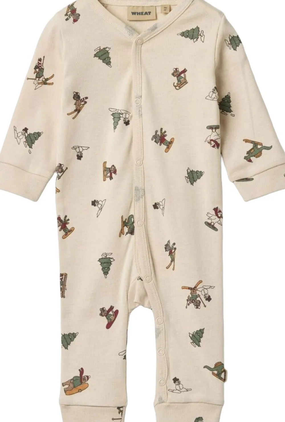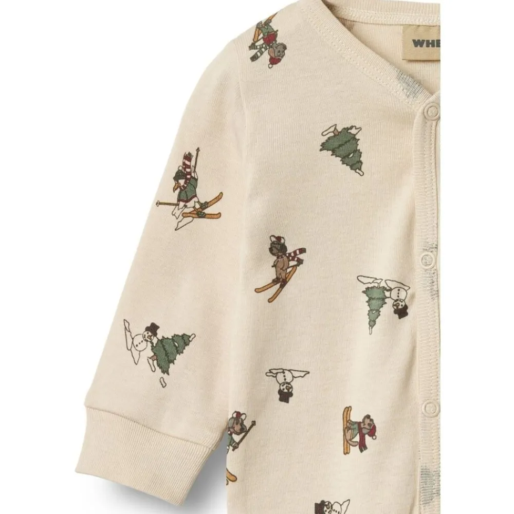 Langærmet heldragt med julemotiver i blødt økologisk bomuld til din baby. – Normal/Løstsiddende pasform – Trykknaplukning ned ad fronten og langs indersømmen – Brede manchetter ved håndled og ankler – Signaturprint med julemotiver Wheats heldragt med julemotiver er perfekt til søde juledage indendørs. Den har trykknapper ned ad fronten og langs indersømmen på benene, hvilket gør det lettere for dig at klæde din baby på. Heldragten kan bruges alene om natten eller som et ekstra lag under hverdagstøj. — – Standard 100 by OEKO-TEX® – 100% Økologisk bomuld – GOTS certificeret